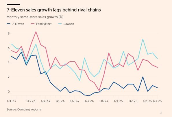 Seven & i Holdings, tập đoàn mẹ của 7-Eleven, đang chịu sức ép lớn nhất. Sau khi từ chối thương vụ thâu tóm trị giá 46 tỷ USD của Alimentation Couche-Tard, công ty phải đối mặt với doanh số trì trệ: chỉ tăng 0,8% mỗi tháng, kém xa FamilyMart và Lawson. Trong khi đó, kế hoạch mở thêm 1.000 cửa hàng mới đến năm 2030 lại khiến 90% chủ cửa hàng hiện tại lo lắng, họ sợ bị cạnh tranh ngay trong cùng hệ thống.