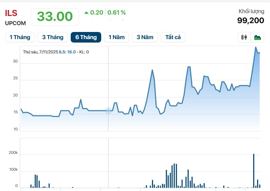 Tuy nhiên, trên thị trường chứng khoán, cổ phiếu ILS đã có chuỗi 4 phiên tăng tốc liên tiếp từ ngày 26/02 đến 03/03, bao gồm 2 phiên tăng trần để vươn lên mốc cao nhất từ trước đến nay là 33.100 đồng/cp. Cập nhật tại 05/3, thị giá ILS tiếp tục duy trì đà tăng nhẹ 0,61% lên mức 33.000 đồng/cp với khối lượng khớp lệnh đạt 99.200 đơn vị.