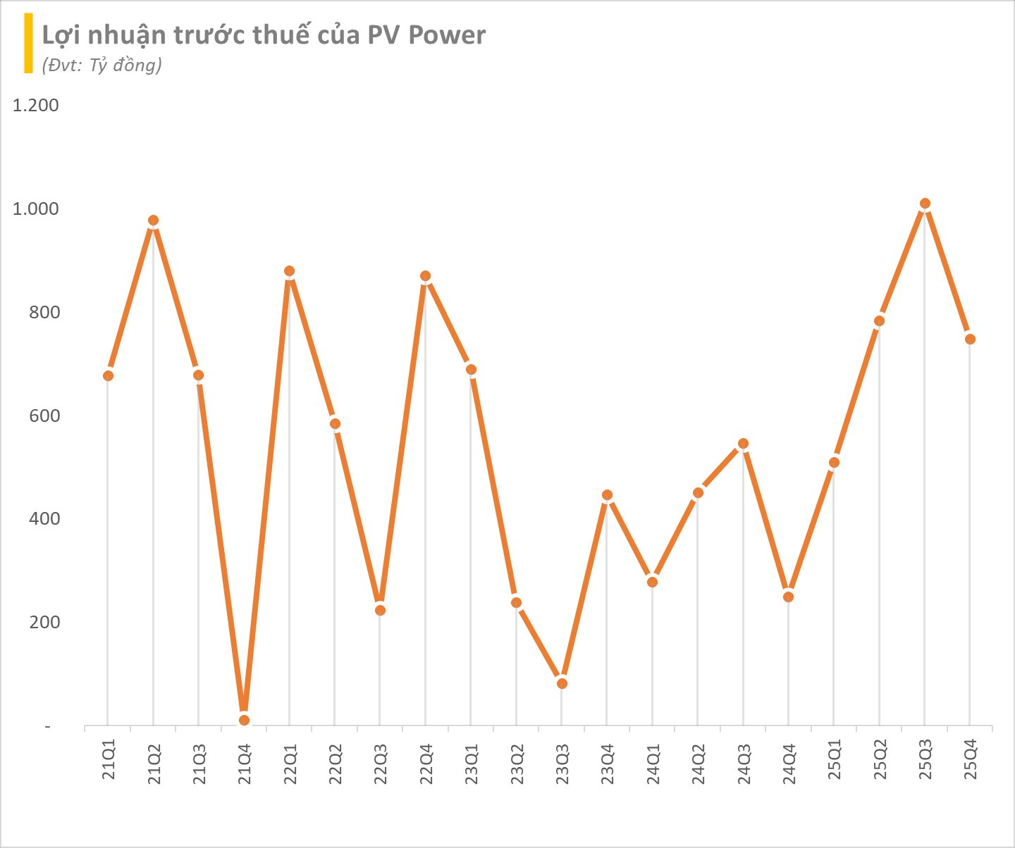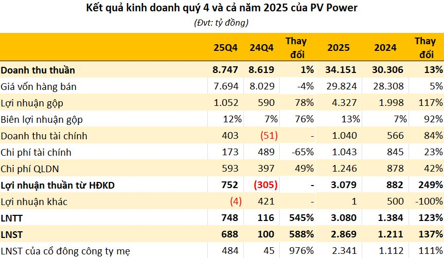 Lũy kế cả năm 2025, doanh thu thuần của PV Power đạt 34.151 tỷ đồng, tăng 13% so với năm trước, lợi nhuận trước thuế đạt 3.080 tỷ đồng, tăng 123%, trong đó lãi ròng tăng 111% lên 2.341 tỷ đồng.
