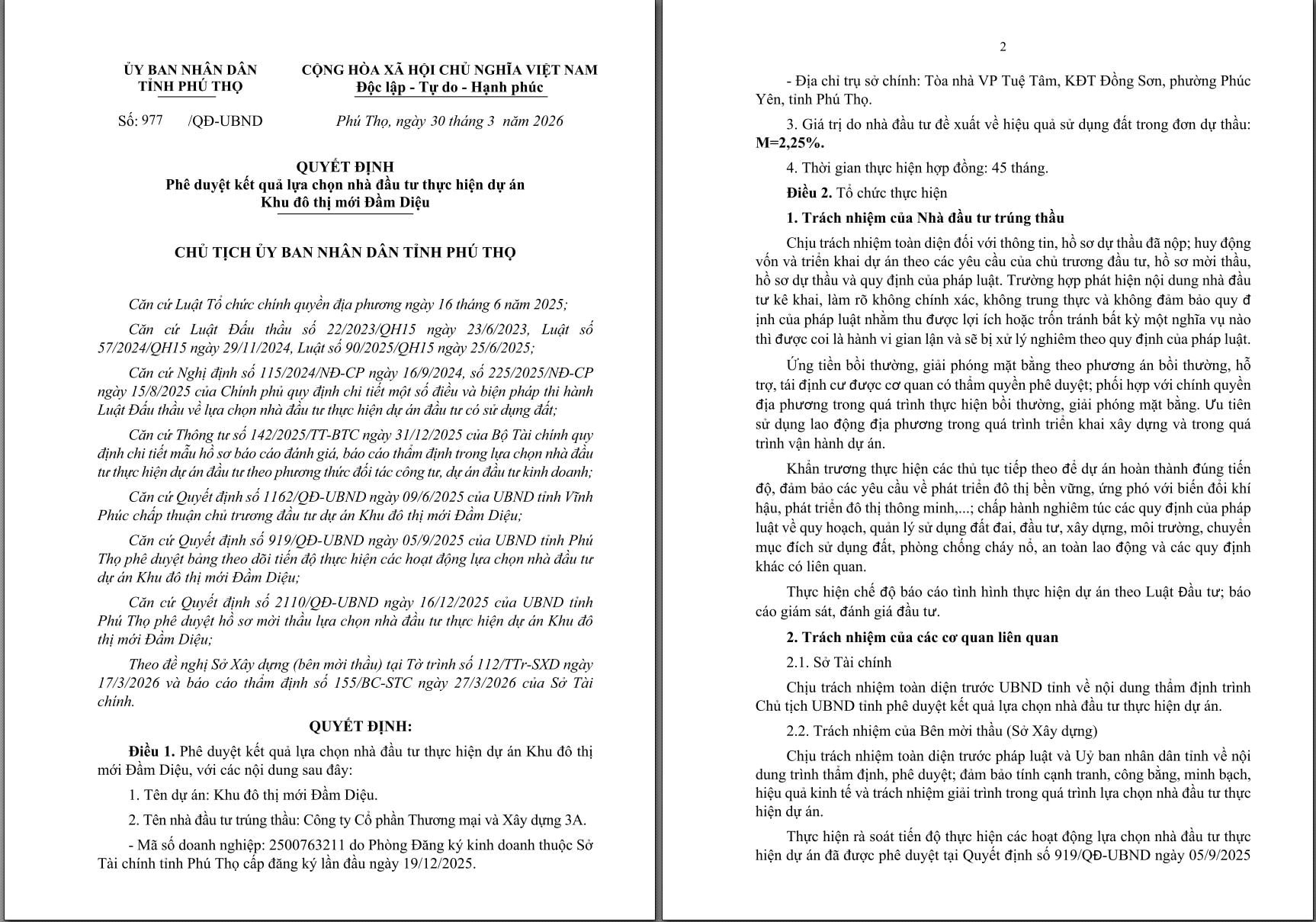 Công ty CP Thương mại và Xây dựng 3A thành lập tháng 12/2025 là nhà đầu tư của dự án Khu đô thị mới Đầm Diệu hơn 5.700 tỷ đồng tại phường Phúc Yên, tỉnh Phú Thọ.