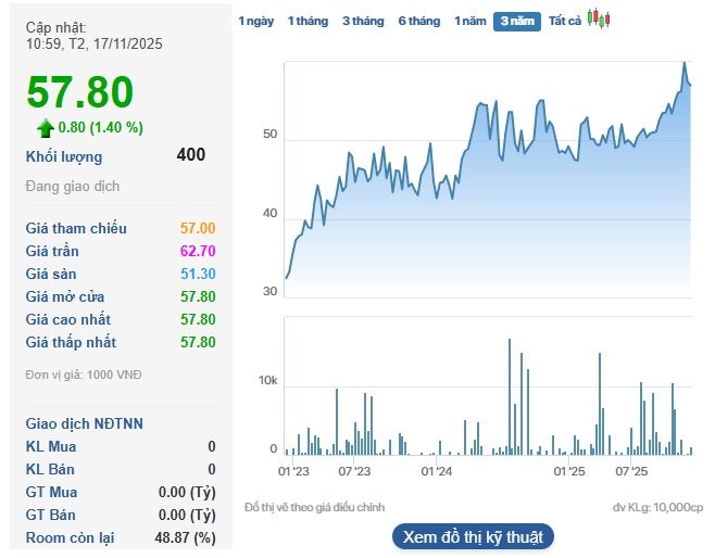 Trên sàn chứng khoán, thị giá NTH đang giao dịch quanh mốc 57.800 đồng/cp, đây cũng là vùng đỉnh lịch sử của cổ phiếu này. Song, thanh khoản khá nhỏ giọt, thường xuyên xuất hiện nhiều phiên giao dịch "tắt thanh khoản".
