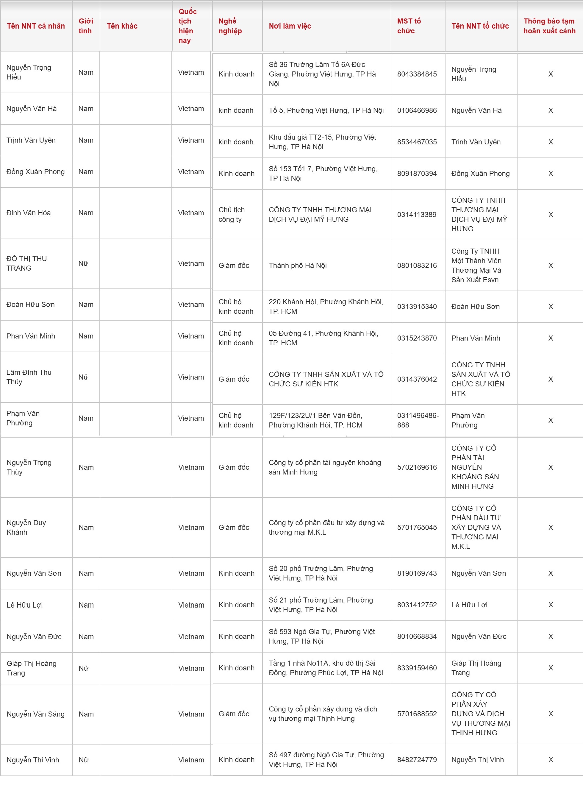 Danh sách người nộp thuế bị thông báo tạm hoãn xuất cảnh gồm: