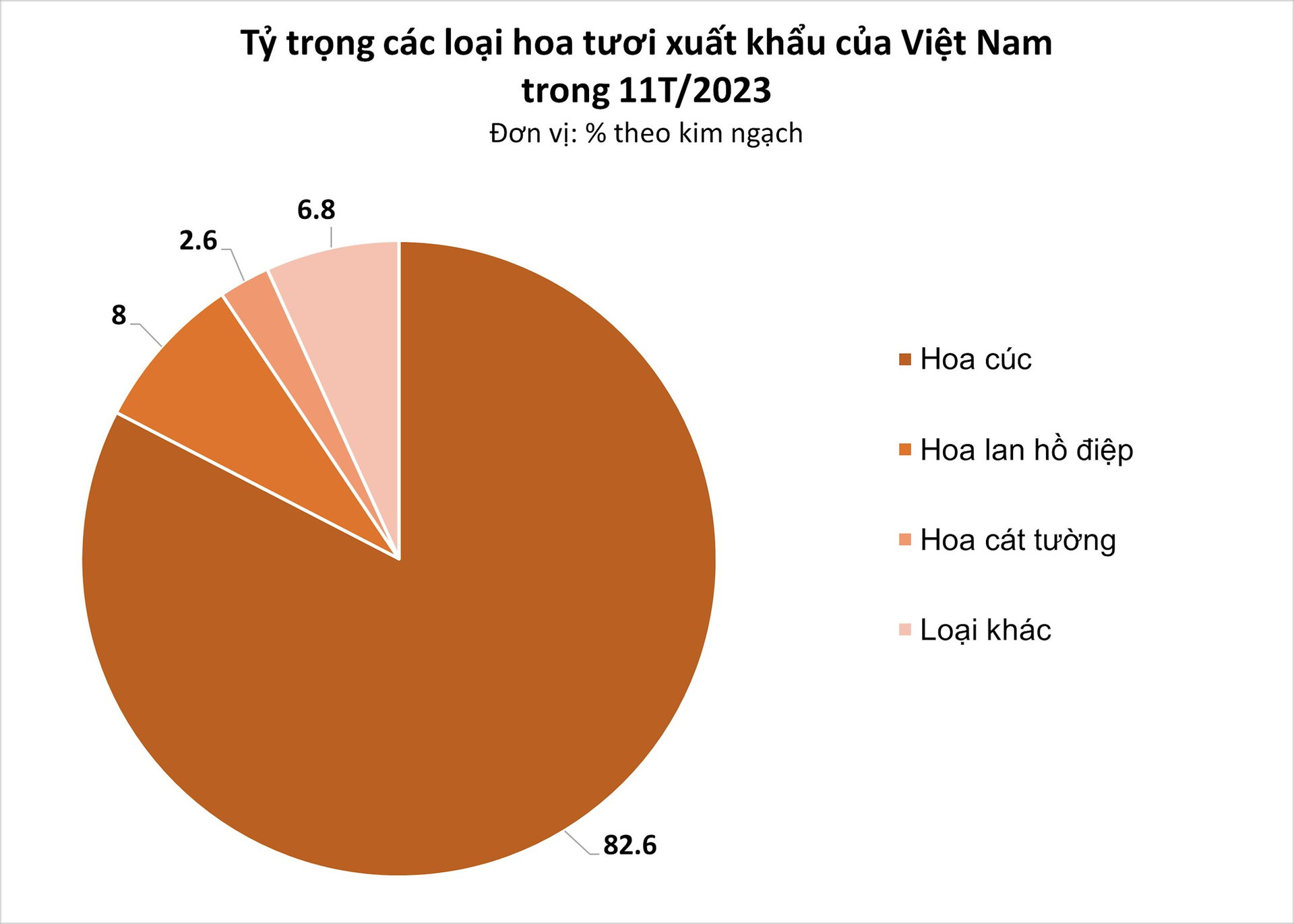 Theo số liệu thống kê sơ bộ của Tổng cục Hải quan, trong tháng 10, xuất khẩu hoa tươi của Việt Nam đạt 6,3 triệu USD, tăng 17,9% so với tháng 10/2022. Tính chung 10 tháng đầu năm 2023, xuất khẩu hoa đạt 57,9 triệu USD, tăng 5,1% so với cùng kỳ năm ngoái.