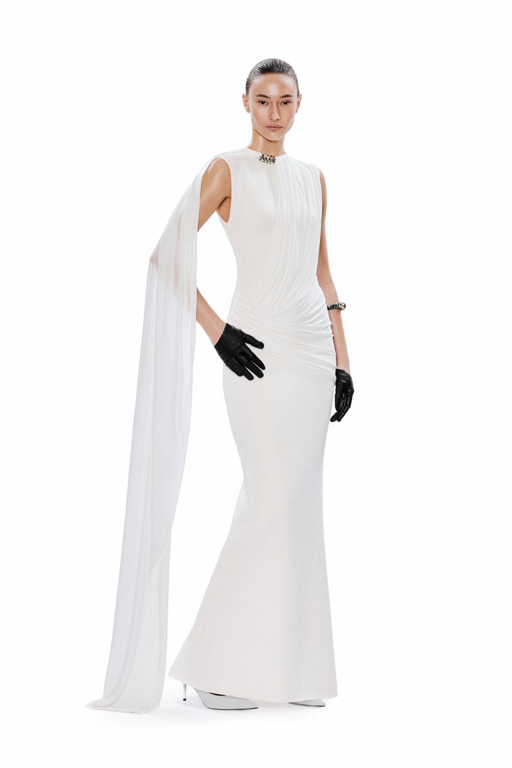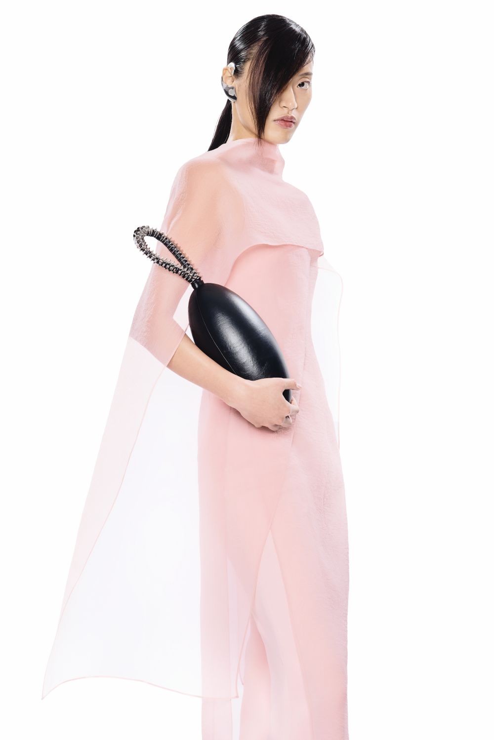 Bộ sưu tập vẫn giữ tinh thần thanh khiết của áo dài Việt, nhưng được làm mềm bằng phom dáng mới, đường cắt tinh giản và cách xử lý chất liệu linh hoạt, tạo nên những tà áo bay bổng, phóng khoáng mà vẫn kín đáo. Song song đó là các thiết kế đầm bodycon, lệch vai và draping đặc trưng, hướng tới hình ảnh người phụ nữ năng động, linh hoạt trong nhiều bối cảnh.