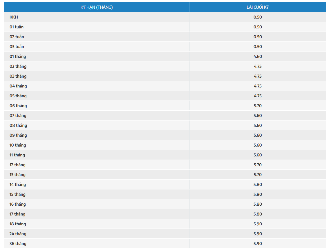 Hiện lãi suất cho các kỳ hạn 2 – 5 tháng tại nhà băng này đã được nâng lên 4,75%/năm — mức trần theo quy định của Ngân hàng Nhà nước đối với kỳ hạn dưới 6 tháng.