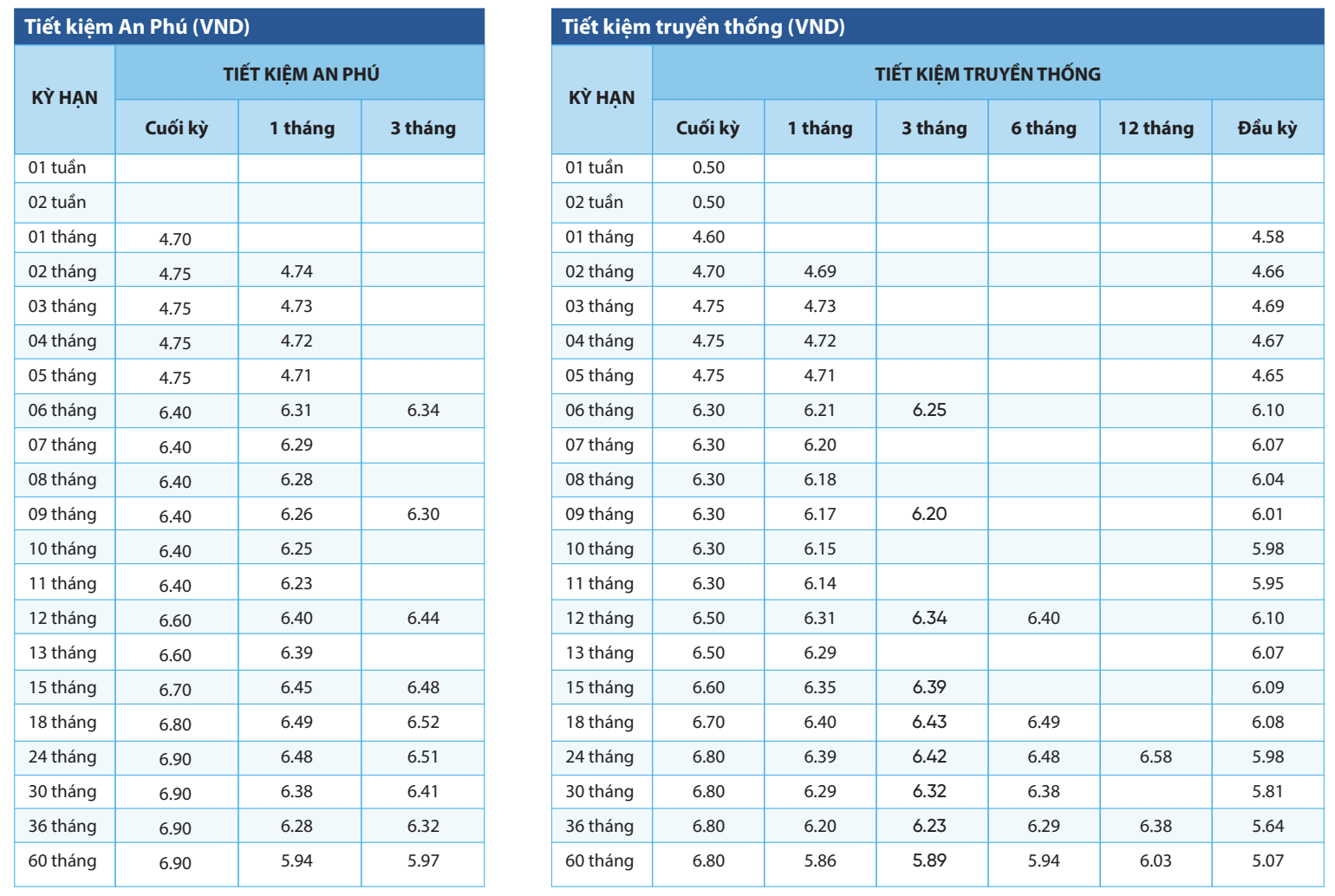 Song song với sản phẩm Tiết kiệm An Phú, NCB cũng điều chỉnh tăng lãi suất đối với sản phẩm tiết kiệm truyền thống. Theo đó, lãi suất kỳ hạn 1 và 2 tháng lần lượt được nâng lên 4,6%/năm và 4,7%/năm, tăng khoảng 0,2 điểm % so với trước. Các kỳ hạn từ 3 đến 5 tháng được niêm yết mới tại 4,75%/năm, tương ứng mức tăng phổ biến từ 0,05 đến 0,15 điểm %.