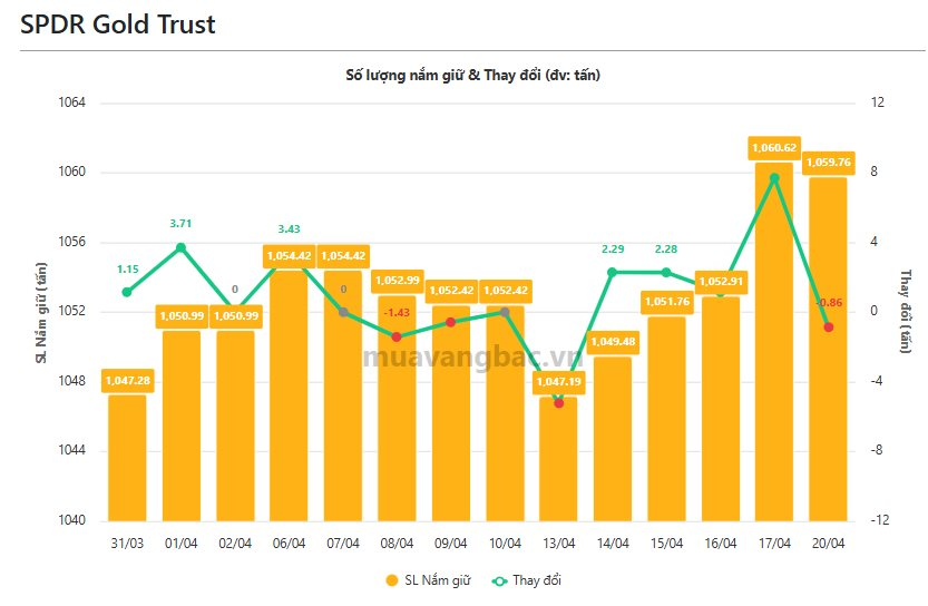 Theo cập nhật từ Muavangbac.vn, quỹ vàng lớn nhất thế giới SPDR Gold Trust đã quay đầu bán ròng 8,6 tạ vàng trong ngày 20/4, ngắt chuỗi mua vào 4 phiên liên tiếp. Tổng lượng vàng quỹ này nắm giữ giảm còn gần 1.060 tấn.