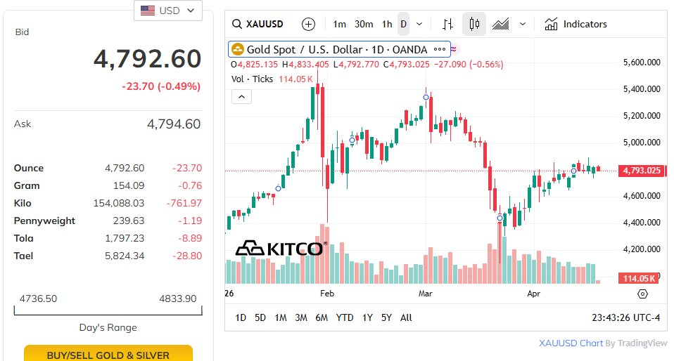 Theo dữ liệu từ sàn Kitco, giá vàng thế giới hiện đang chững lại quanh vùng 4.800 USD/ounce (chốt phiên 20/4).