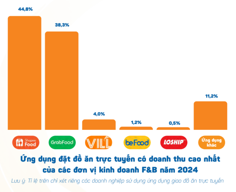 Tuy nhiên, cả ShopeeFood và GrabFood đều sụt giảm về tỷ lệ thị phần cửa hàng F&B trên toàn quốc. Theo đó, ShopeeFood vẫn là ứng dụng được nhiều cửa hàng sử dụng nhất - chiếm 38,8%, GrabFood chiếm 36,7%. Nhìn lại năm 2023, tỷ trọng của ShopeeFood và GrabFood lần lượt là 42,94% và 40,61%.