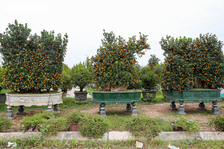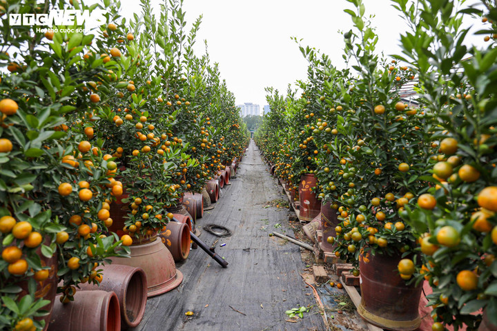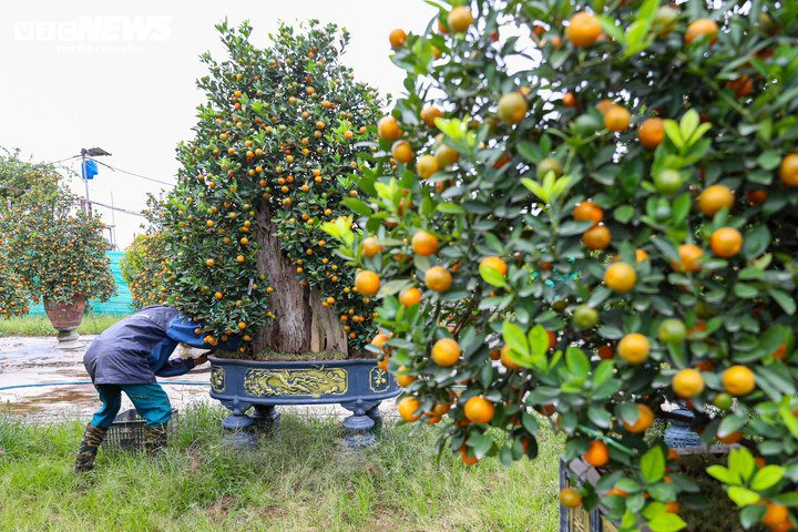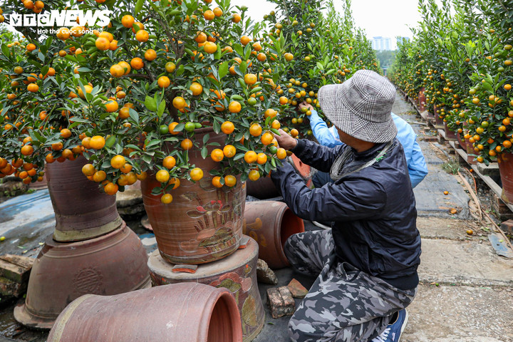 Không chỉ quất gỗ lũa, nhiều dòng quất khác tại làng Tứ Liên cũng đã được lên chậu, chuẩn bị xuất vườn. Người dân tất bật chăm sóc, vận chuyển quất phục vụ mùa cao điểm.