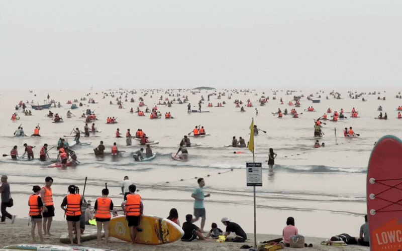 Đoạn video trên Threads ghi lại cảnh tượng hàng trăm chiếc SUP đủ màu dập dềnh trên sóng nước, người người san sát nhau, thi thoảng ván này lại va cộc vào ván kia giữa tiếng cười nói rôm rả.