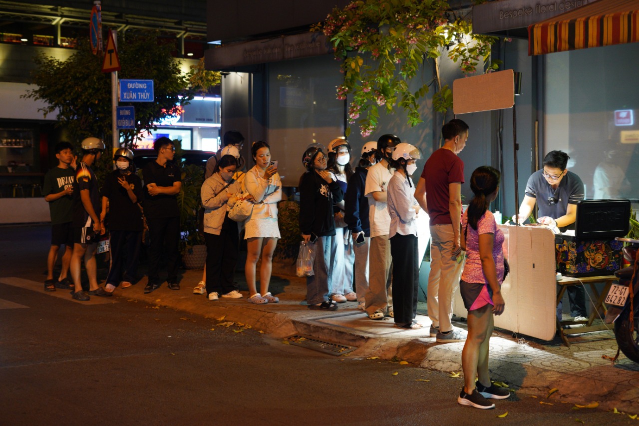 Dù quán thông báo mở cửa lúc 18h30, nhưng ngay từ 17h, dòng người đã xếp hàng dài dằng dặc dọc vỉa hè, có những lúc kéo dài hàng chục mét. Ai nấy đều kiên nhẫn đứng đợi, tay cầm điện thoại, ánh mắt đổ dồn về phía xe hàng nhỏ, mong ngóng đến lượt mình.