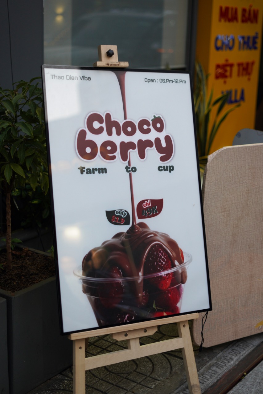 Nằm tại khu Thảo Điền vốn nổi tiếng với mức chi phí đắt đỏ, nhưng tiệm dâu Choco Berry lại gây bất ngờ với mức giá cực kỳ hợp lý. Theo bảng giá được treo trên chiếc giá đỡ nhỏ, mức giá chỉ từ 49.000 đồng cho một ly dâu tây chocolate chất lượng. Đây được xem là con số rất hời cho một món ăn sử dụng nguyên liệu tươi và làm mới mỗi ngày, đặc biệt là khi so sánh với mức giá trung bình của các món tráng miệng khác trong khu vực.