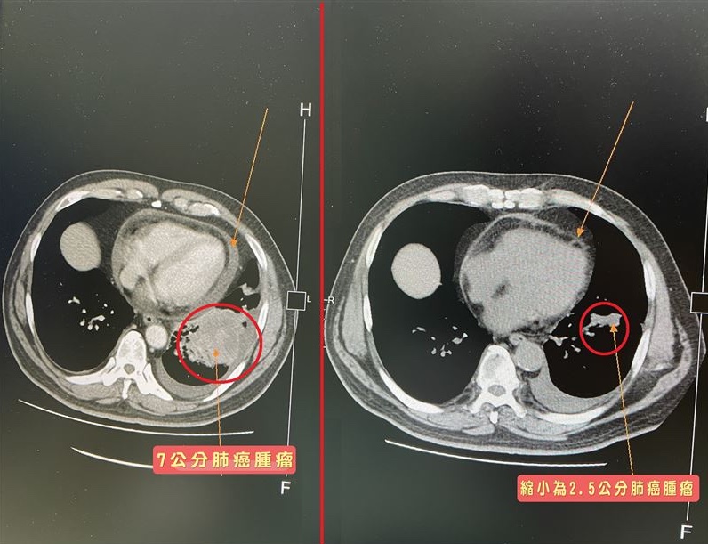 Khi nhập viện, ông phải dẫn lưu khẩn cấp 800ml dịch máu từ màng ngoài tim. Sau đó, sinh thiết xác nhận ung thư biểu mô tuyến phổi. Ông được hóa trị ngay, sau 4 đợt khối u thu nhỏ còn 2,5cm, triệu chứng tức ngực cải thiện rõ rệt. Tuy nhiên, tiên lượng của ông vẫn rất xấu do phát hiện muộn và có nhiều bệnh lý khác cùng lúc.