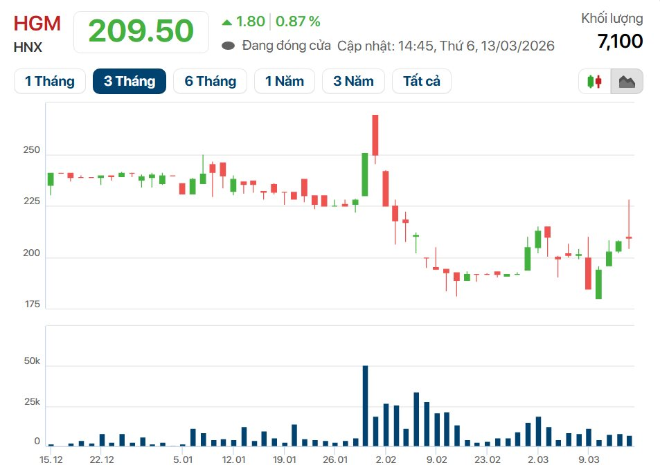 Trên thị trường chứng khoán, ngày 13/03/2026, thị giá HGM dừng tại mức 209.500 đồng/cổ phiếu, tăng 0,87% so với phiên trước đó.