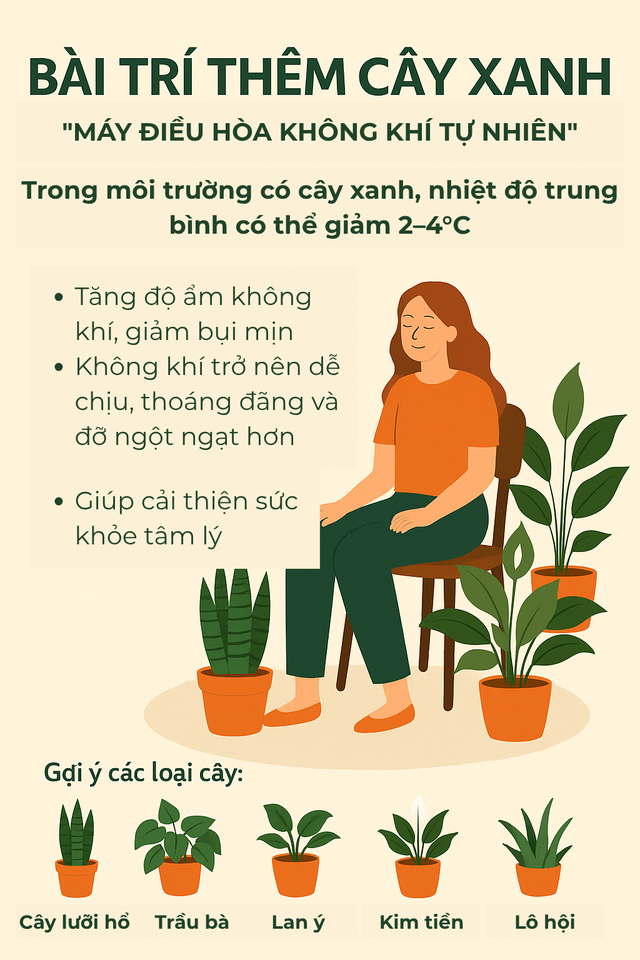 Đồng thời, phương pháp này còn giúp tăng độ ẩm không khí, giảm bụi mịn, giúp không khí trở nên dễ chịu, thoáng đãng và đỡ ngột ngạt hơn, đặc biệt vào ngày nắng nóng cao điểm. Một báo cáo từ Đại học Công nghệ Sydney (UTS) năm 2020 cũng chỉ ra rằng, trong môi trường có cây xanh, nhiệt độ trung bình có thể giảm 2–4°C, đồng thời giúp cải thiện sức khỏe tâm lý trong những ngày oi bức.