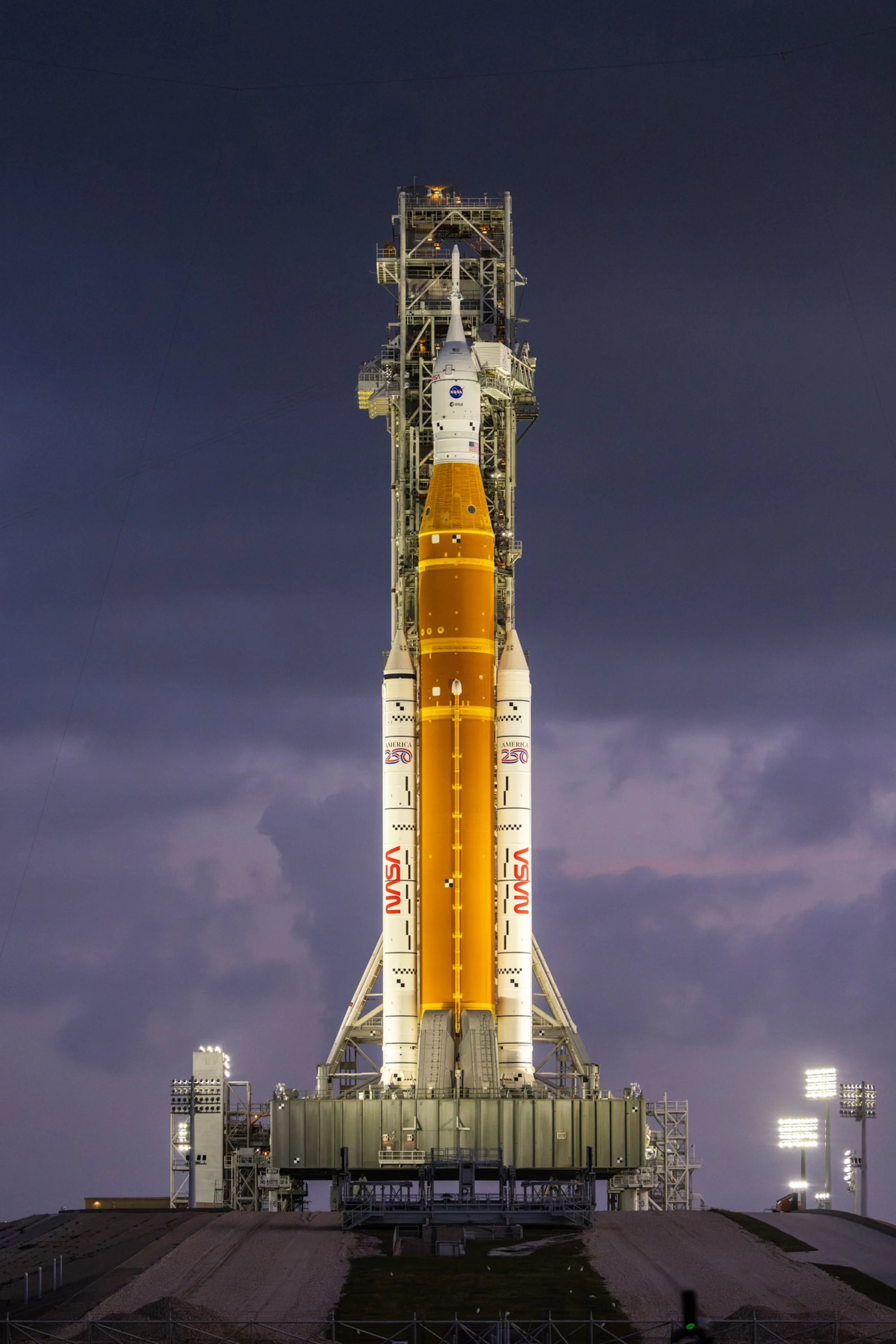 Cao 98 mét, Artemis II đứng sừng sững trong ánh bình minh tại Trung tâm Vũ trụ Kennedy, một ngày trước khi diễn ra vụ phóng lịch sử.