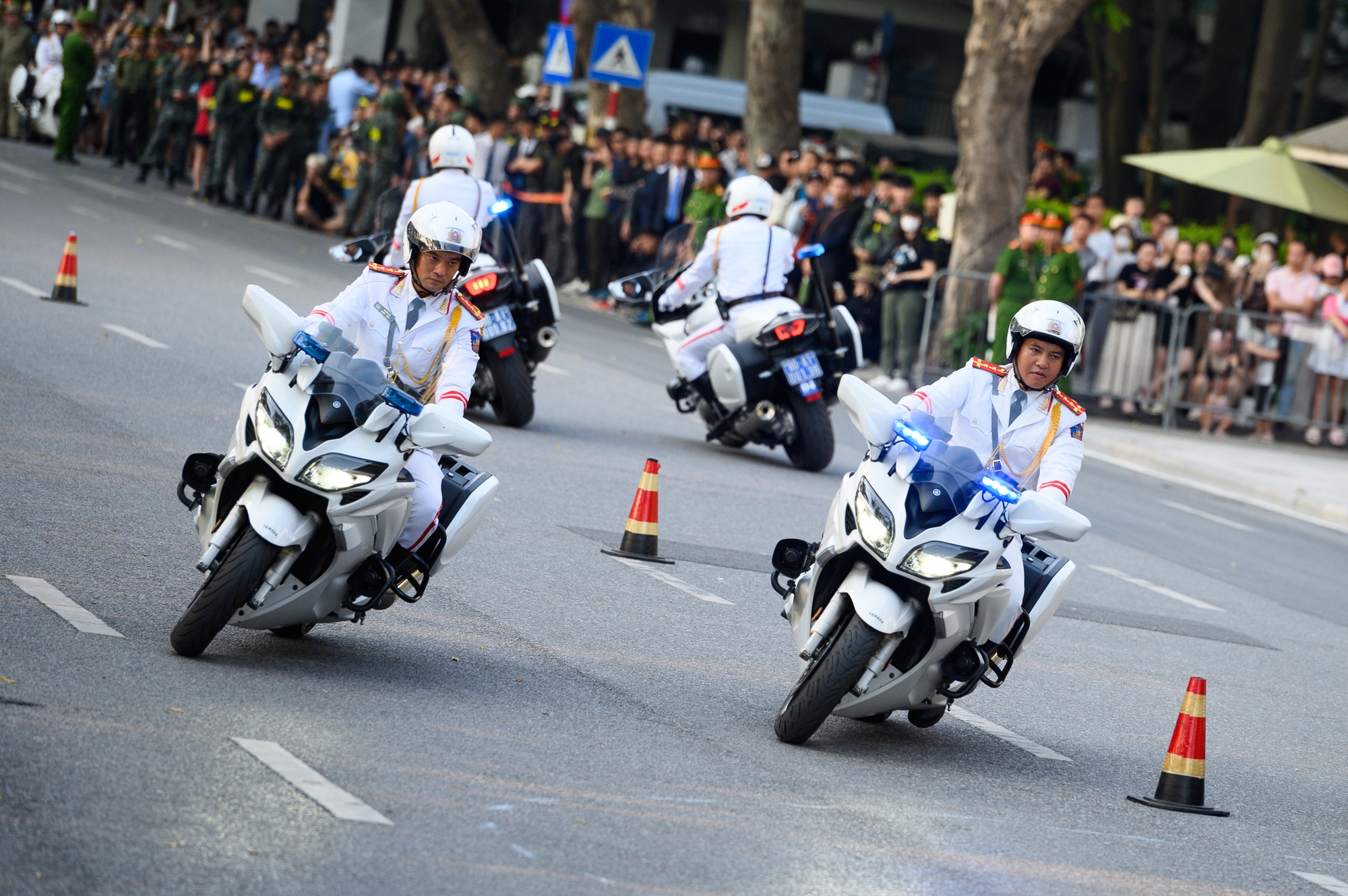 Lực lượng mô tô dẫn đoàn thuộc Bộ Tư lệnh Cảnh vệ có màn trình diễn lái xe kỹ thuật thuần thục, đẹp mắt.