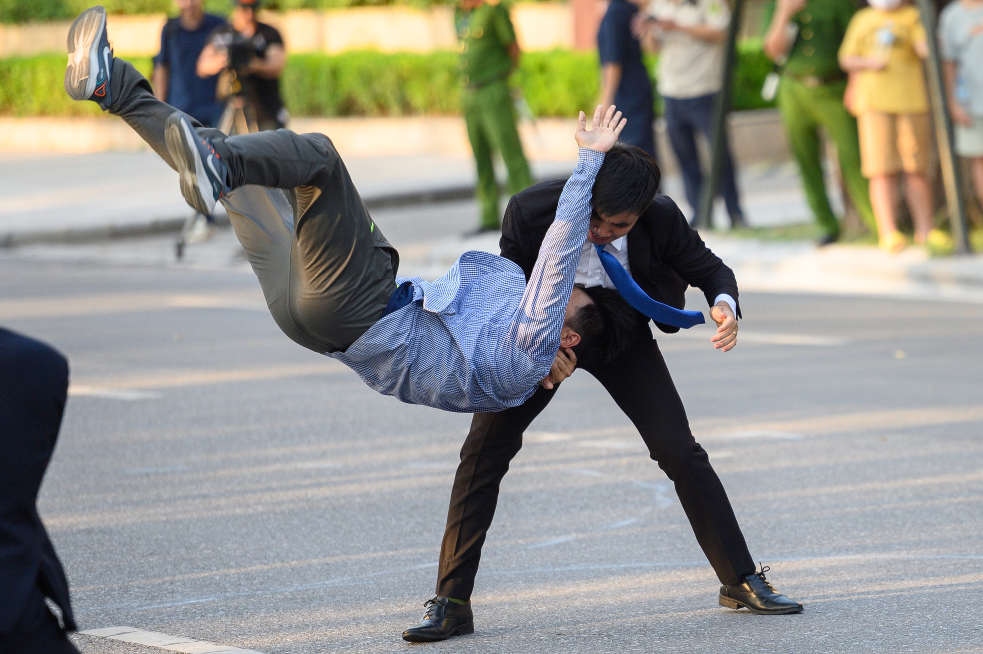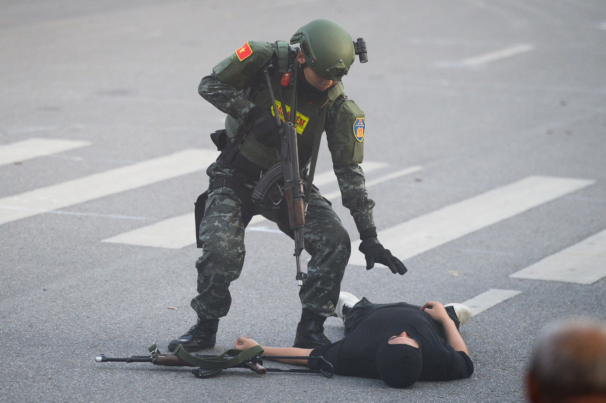 Được trang bị các phương tiện, vũ khí hiện đại, lực lượng chức năng nhanh chóng triển khai đội hình, tạo vòng bảo vệ an toàn cho yếu nhân. Chỉ trong thời gian ngắn, nhóm khủng bố giả định đã bị khống chế.