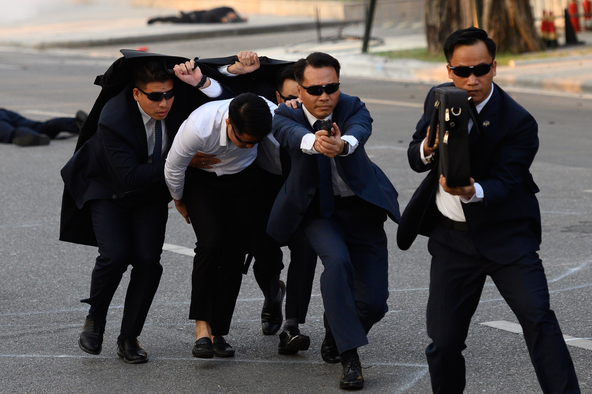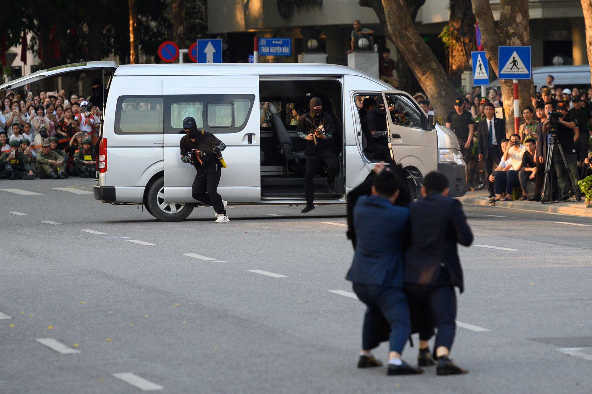 Một trong những phần trình diễn được người dân chờ đợi nhất là tình huống giả định bảo vệ yếu nhân trước nguy cơ khủng bố. Theo kịch bản, đoàn xe chở yếu nhân bất ngờ bị một nhóm khủng bố phục kích, tấn công bằng súng và lựu đạn.