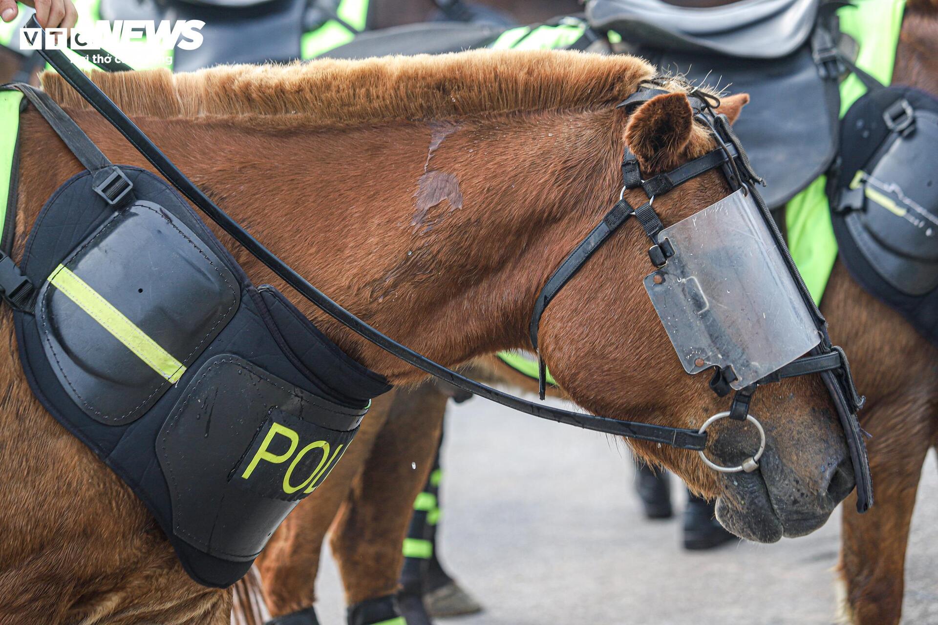 Những chú ngựa thân hình vạm vỡ, được trang bị giáp bảo hộ chắc chắn, di chuyển nhịp nhàng dưới sự chỉ huy nghiêm ngặt của các chiến sĩ cảnh sát cơ động. Mỗi bước chạy, mỗi vòng quay đều tuân thủ chính xác theo hiệu lệnh.