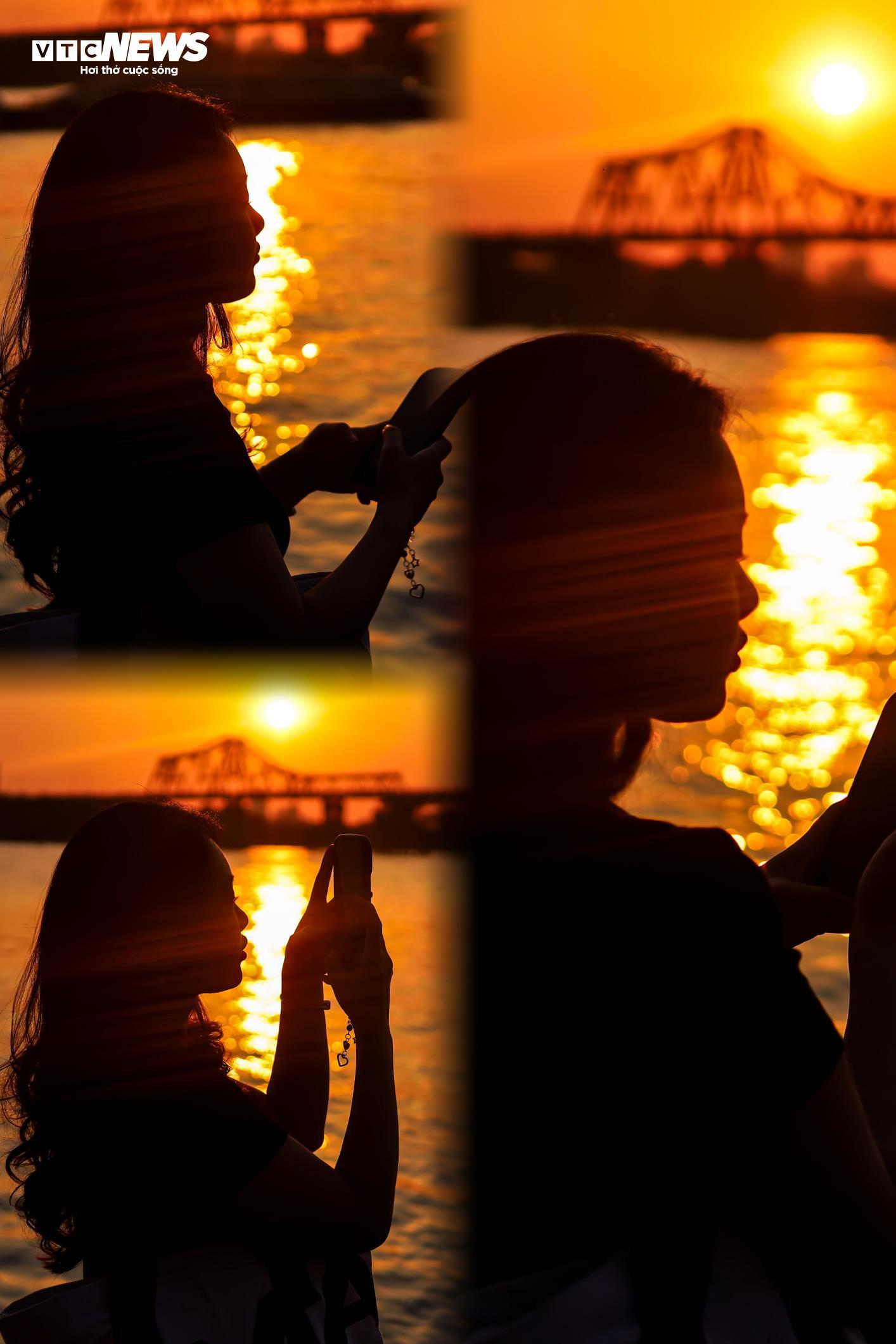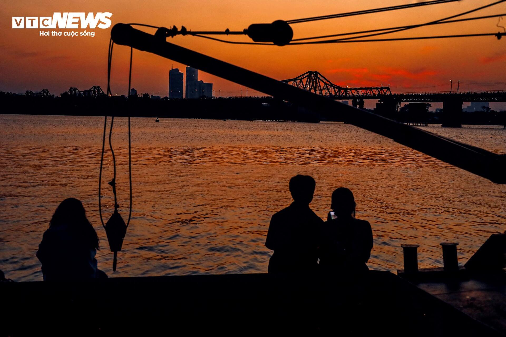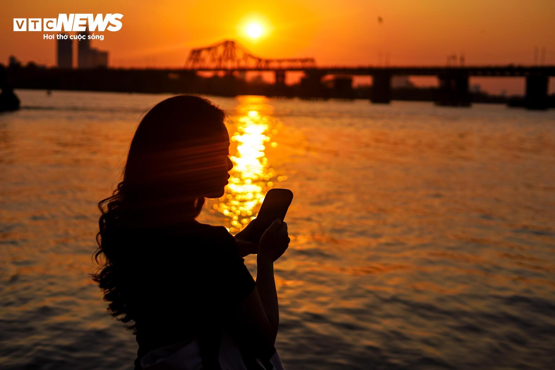 Nhiều người dạo bước trên cầu, có người dựng xe đạp bên lan can, tựa mình nhìn ra xa, nơi ánh mặt trời dần khuất sau những mái nhà phía quận Long Biên, Tây Hồ... để ngắm cảnh, tận hưởng.