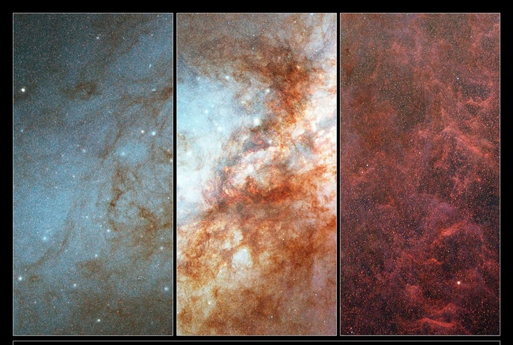 Hình ảnh từ kính viễn vọng Hubble cho thấy bên trong lõi của M82 có những ngôi sao rực rỡ. Ánh sáng của chúng bị che khuất bởi những đám mây có hình dạng kỳ lạ được tạo thành từ các cụm và vệt bụi và khí.
