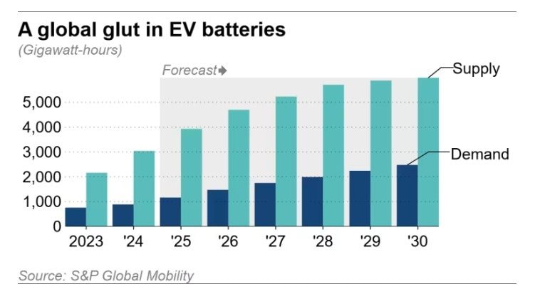 Theo số liệu mới nhất từ Nikkei dựa trên dữ liệu S&P Global Mobility, ngành sản xuất pin xe điện (EV) toàn cầu đang bước vào giai đoạn dư cung nghiêm trọng.