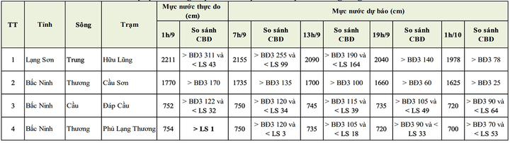 Dự báo trong 12 giờ tới, lũ trên sông Cầu tại trạm Đáp Cầu sẽ xuống chậm và ở trên mức BĐ3. Lũ trên sông Thương tại trạm Cầu Sơn và trạm Phủ Lạng Thương, trên sông Trung tại trạm Hữu Lũng tiếp tục xuống và ở trên mức BĐ3.