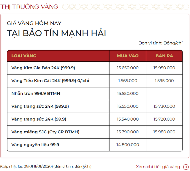 Trong tuần qua (5/1 - 11/1), giá vàng trong nước tăng mạnh trên diện rộng và thiết lập mặt bằng giá cao hơn rõ rệt so với mức chốt phiên cuối tuần trước. Cụ thể, giá vàng miếng tăng đồng loạt 7 triệu đồng/lượng, trong khi vàng nhẫn ghi nhận mức tăng phổ biến trong khoảng 4,5 – 8,4 triệu đồng/lượng tùy thương hiệu.