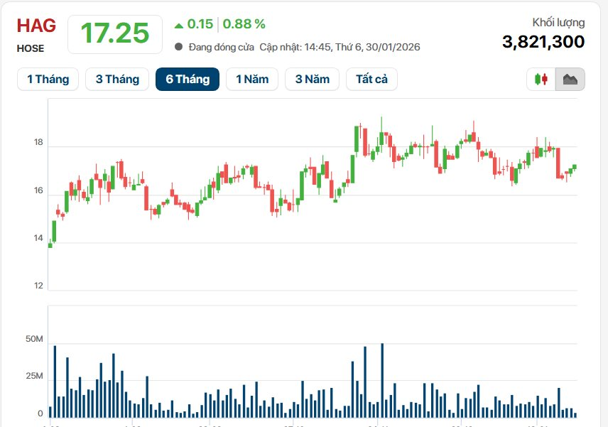 Trên thị trường chứng khoán, phản ứng trước thông tin tích cực từ báo cáo tài chính, cổ phiếu HAG kết phiên giao dịch ngày 30/1/2026 trong sắc xanh tại mức giá 17.250 đồng/cổ phiếu, tăng gần 1% so với tham chiếu. Thanh khoản duy trì ở mức tốt với hơn 3,8 triệu đơn vị được sang tay. Tính trong 6 tháng qua, thị giá HAG đã thiết lập mặt bằng giá mới, phục hồi mạnh mẽ từ vùng 13.000 - 14.000 đồng, cho thấy niềm tin của nhà đầu tư đang trở lại mạnh mẽ cùng với bức tranh tài chính sáng màu của doanh nghiệp.