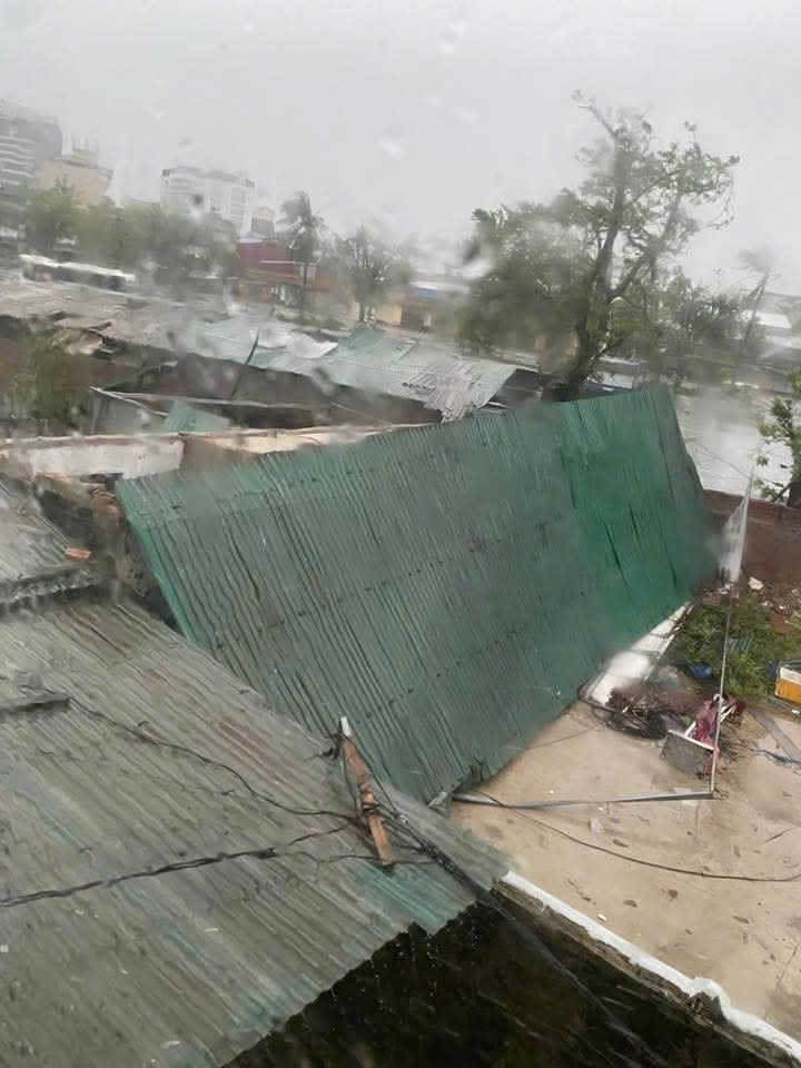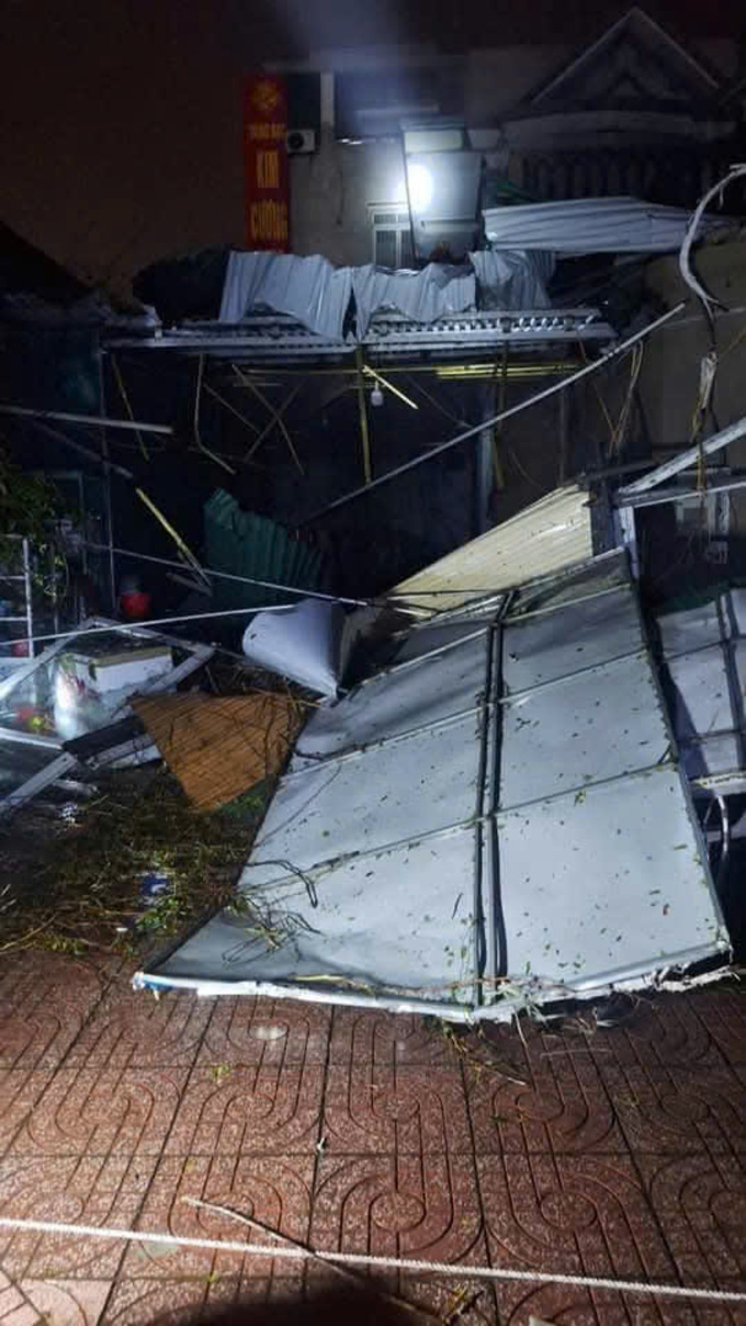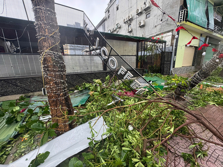 Hệ thống panô, băng rôn, biển hiệu quảng cáo bị gió bão quật đổ xuống đường. Tại nhiều tòa nhà, cửa kính vỡ tan tành.