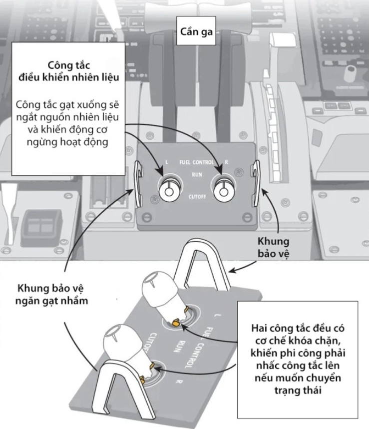 Vị trí công tắc điều khiển nhiên liệu trên máy bay Boeing 787. Đồ họa: Seattle Times