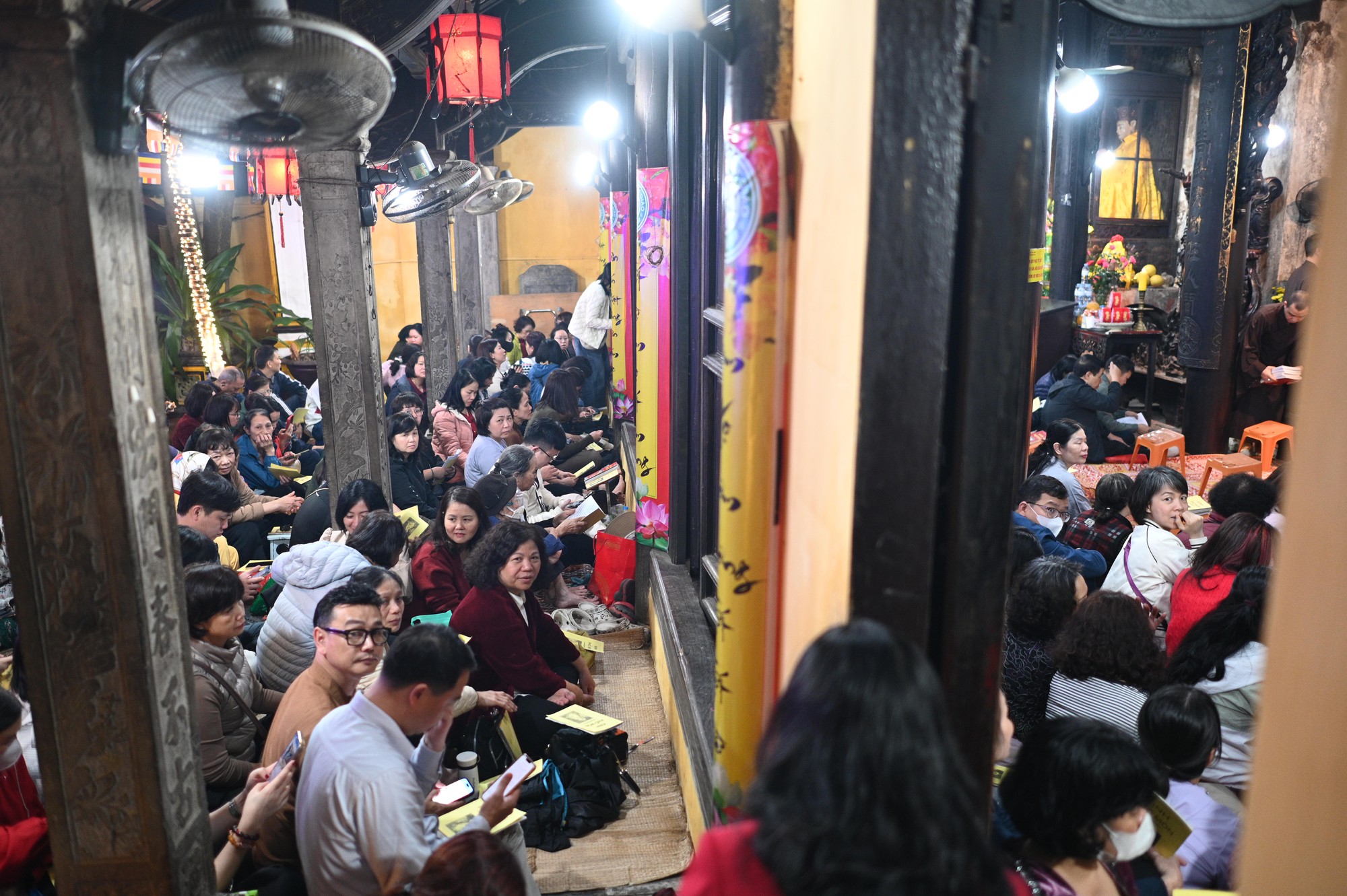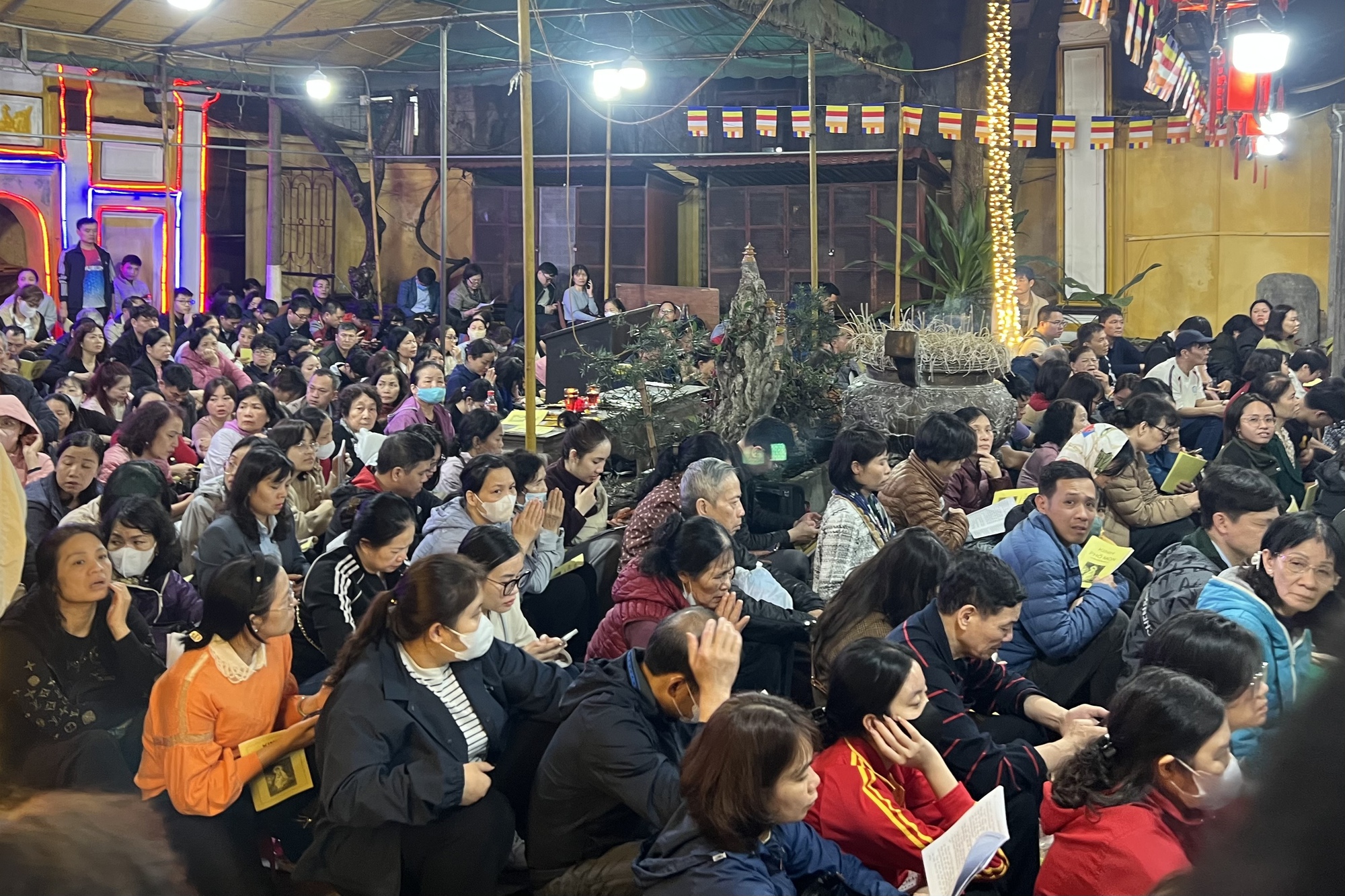 Đến khoảng 19h30, khuôn viên chùa gần như kín chỗ, người dân ngồi ngay ngắn theo sự sắp xếp của ban tổ chức