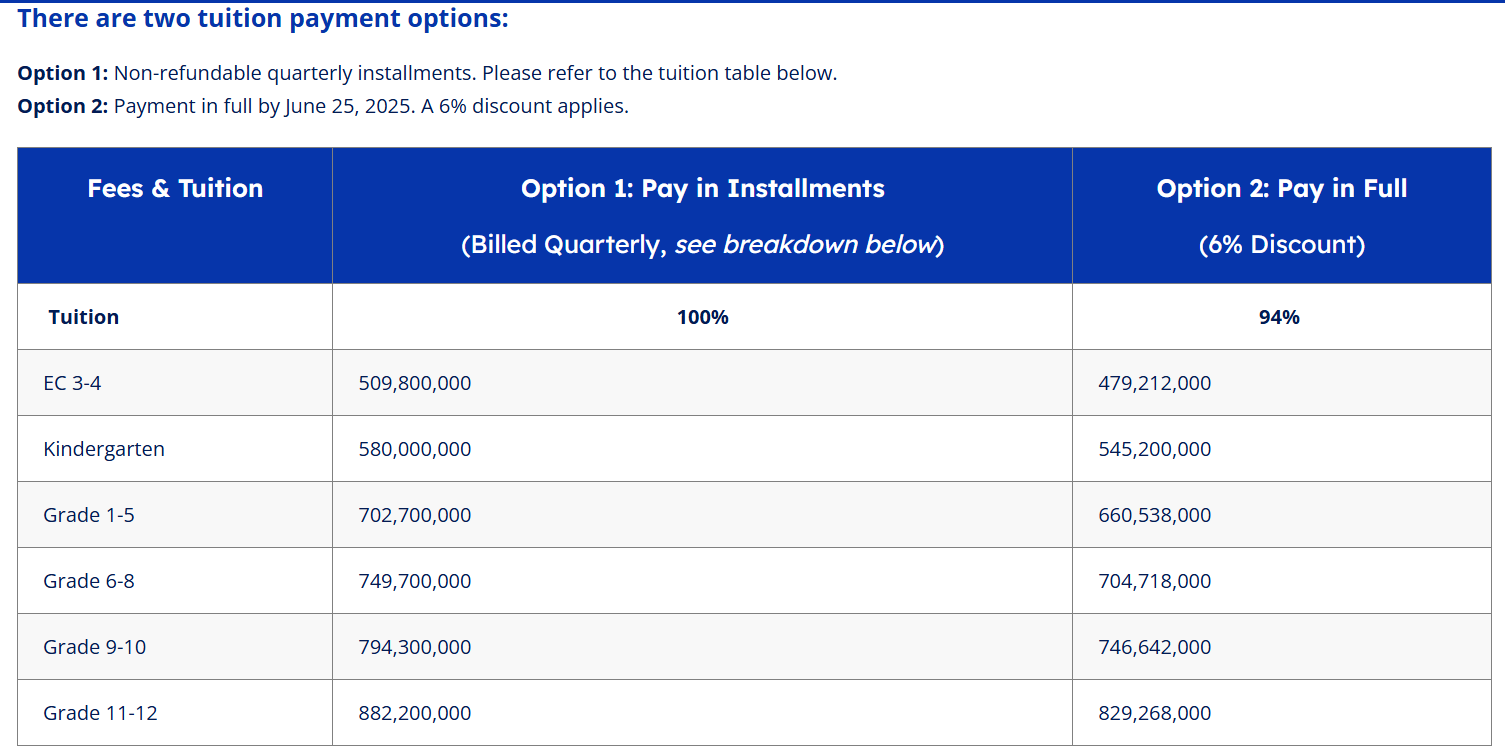 Về học phí, trường SSIS đưa ra hai phương án thanh toán học phí để phụ huynh lựa chọn. Phương án 1 là đóng học phí theo quý, không hoàn lại, áp dụng 100% mức học phí, trong khi phương án 2 là thanh toán toàn bộ trước ngày 25/6/2025 với ưu đãi giảm 6%. Mức học phí tại SSIS dao động từ khoảng 479 triệu đồng đến 882 triệu đồng/năm, tùy khối lớp và phương án thanh toán.