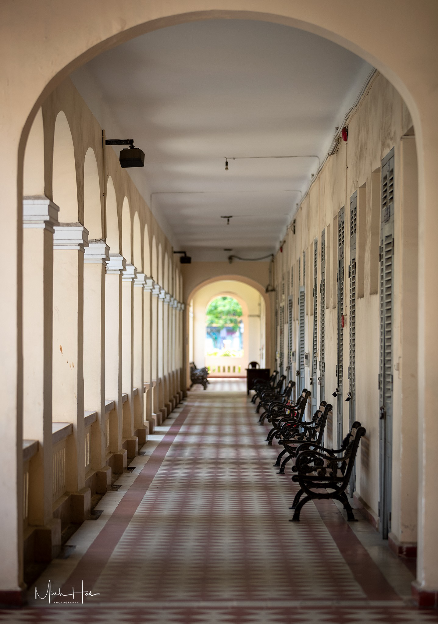 Khuôn viên chính của trường gồm ba dãy phòng học và một dãy hành lang phía trước, mở ra sân lớn ở trung tâm. Các dãy phòng học đều có lầu và hành lang rộng, với hệ thống khung vòm tạo nhịp điệu kiến trúc, giúp tăng cường ánh sáng tự nhiên và gợi nhớ đến phong cách Romanesque cổ.