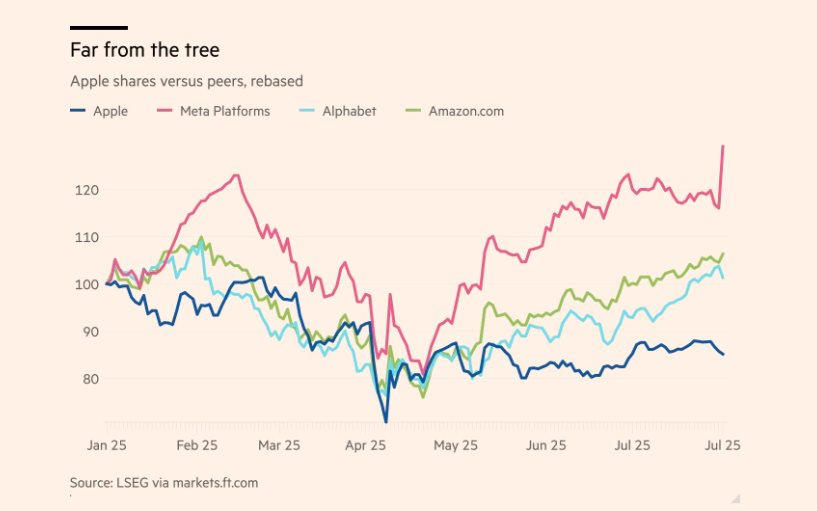 Và không phải tất cả sự khác biệt này đều là điều tích cực. Trong nhóm “Magnificent 7” – bảy cổ phiếu công nghệ hàng đầu của Mỹ – Apple là cái tên có hiệu suất kém thứ hai trong năm 2025, chỉ đứng trên Tesla, khi giá cổ phiếu giảm 15%. Trong khi các lãnh đạo công nghệ khác liên tục ca ngợi triển vọng AI đầy hứa hẹn, báo cáo tài chính quý gần nhất của Apple (công bố ngày thứ năm) lại xoay quanh những chủ đề trần trụi hơn – thuế quan và kiện tụng.