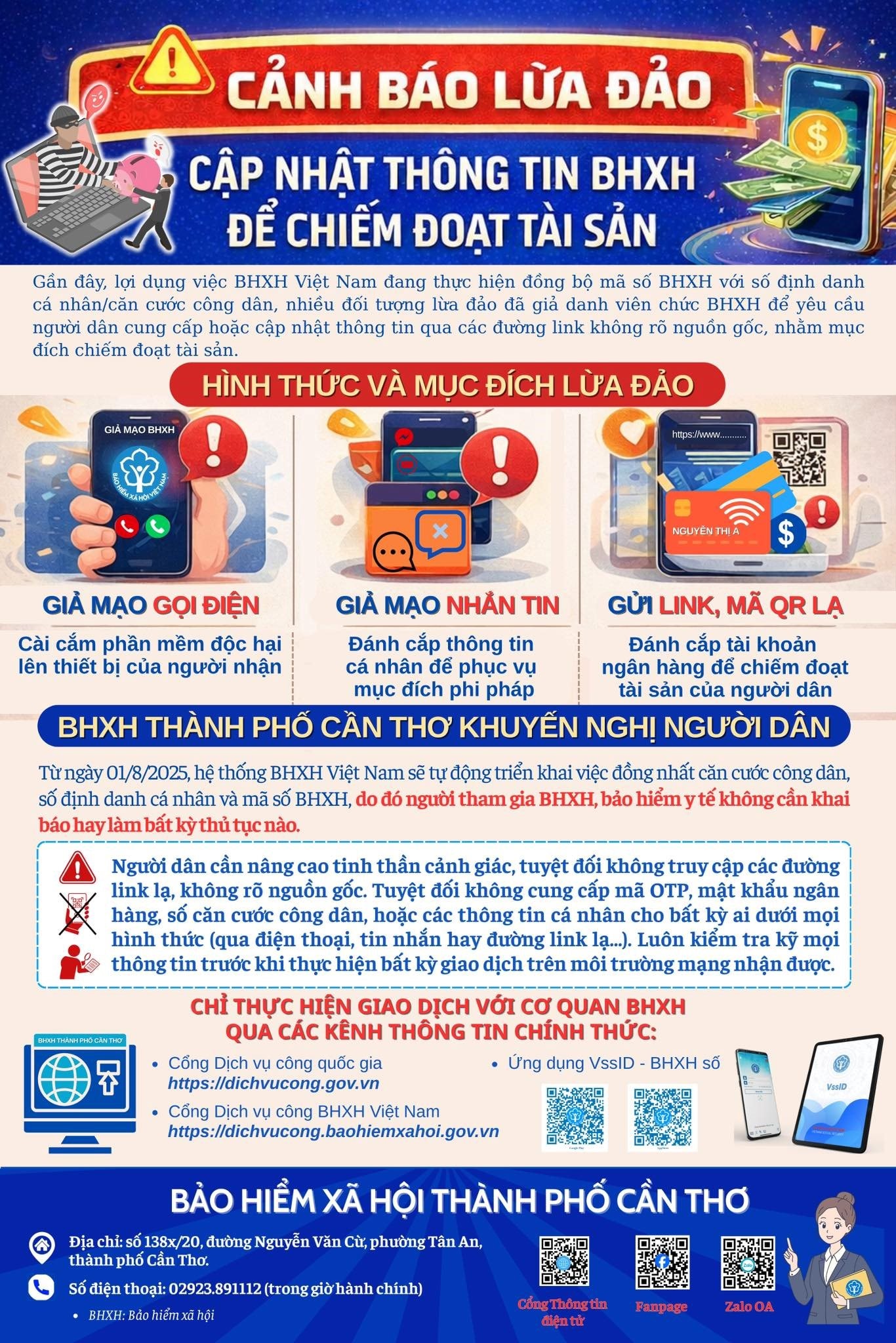BHXH TP Cần Thơ cảnh báo người dân về chiêu trò giả mạo cán bộ bảo hiểm xã hội, yêu cầu cung cấp thông tin cá nhân qua điện thoại, tin nhắn hoặc đường link lạ. (Ảnh; Bảo hiểm xã hội thành phố Cần Thơ)