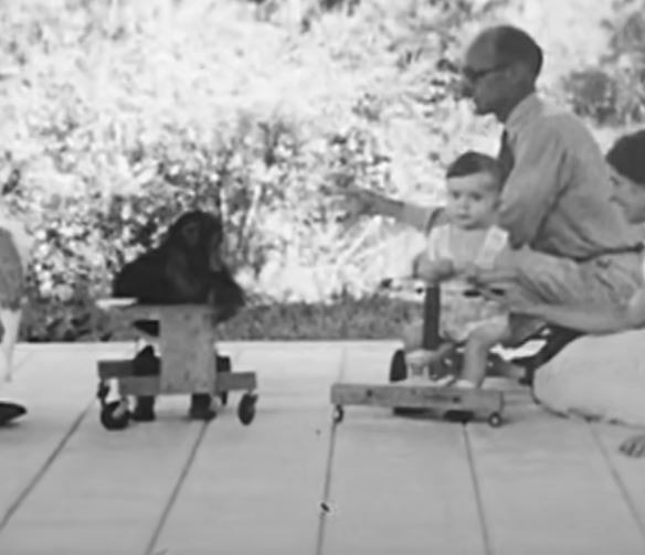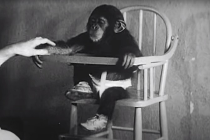 Người làm điều này vào năm 1931 là nhà tâm lý học chuyên nghiên cứu về động vật Winthrop Kellogg. Sở dĩ ông thực hiện điều được mô tả “khó tin” trên bởi muốn kiểm chứng xem môi trường sống có thể tác động thế nào đến việc phát triển của một sinh vật.