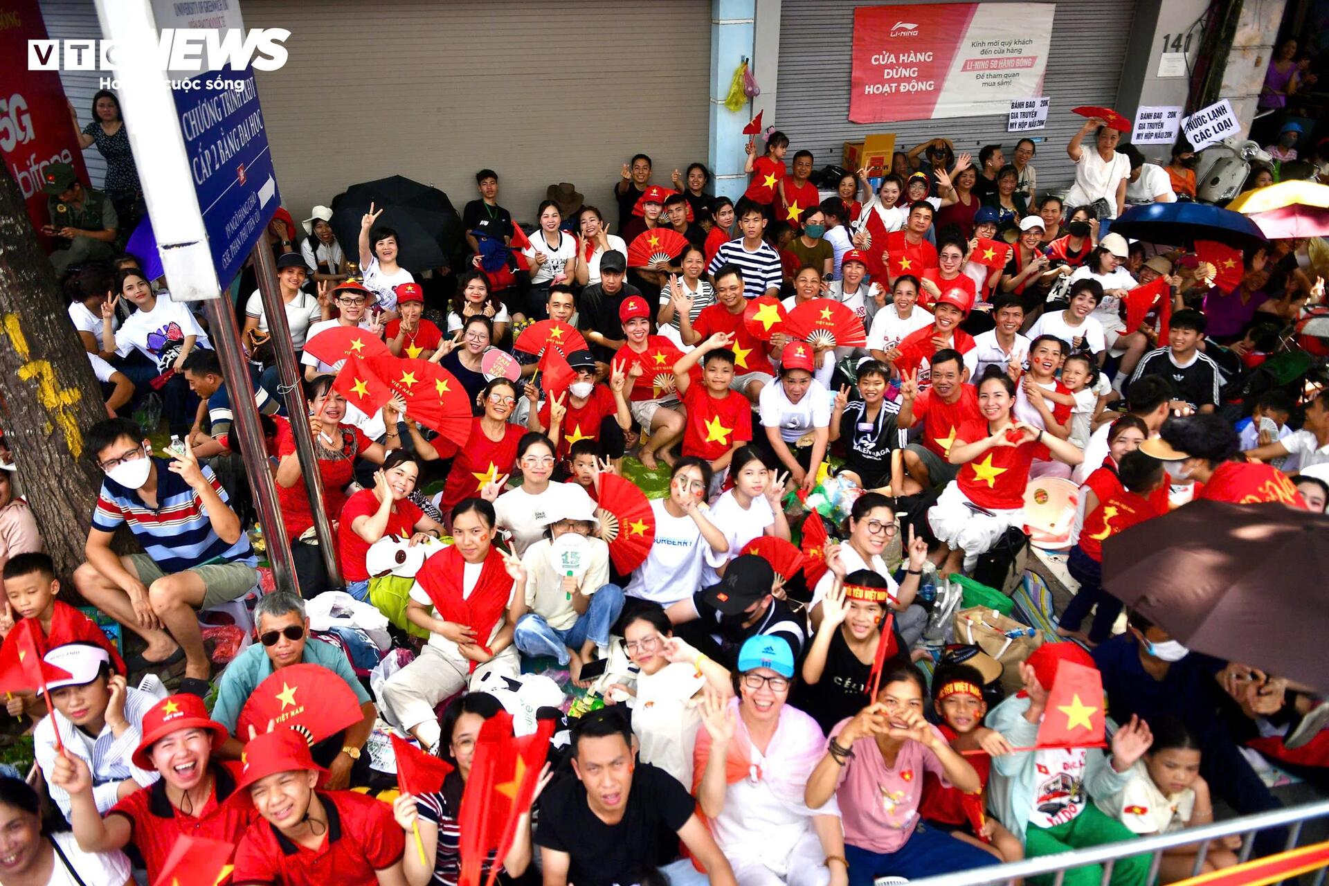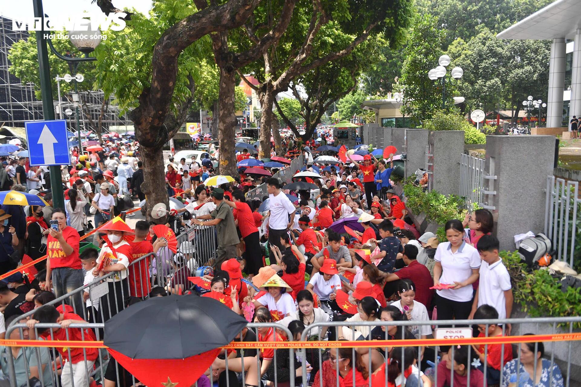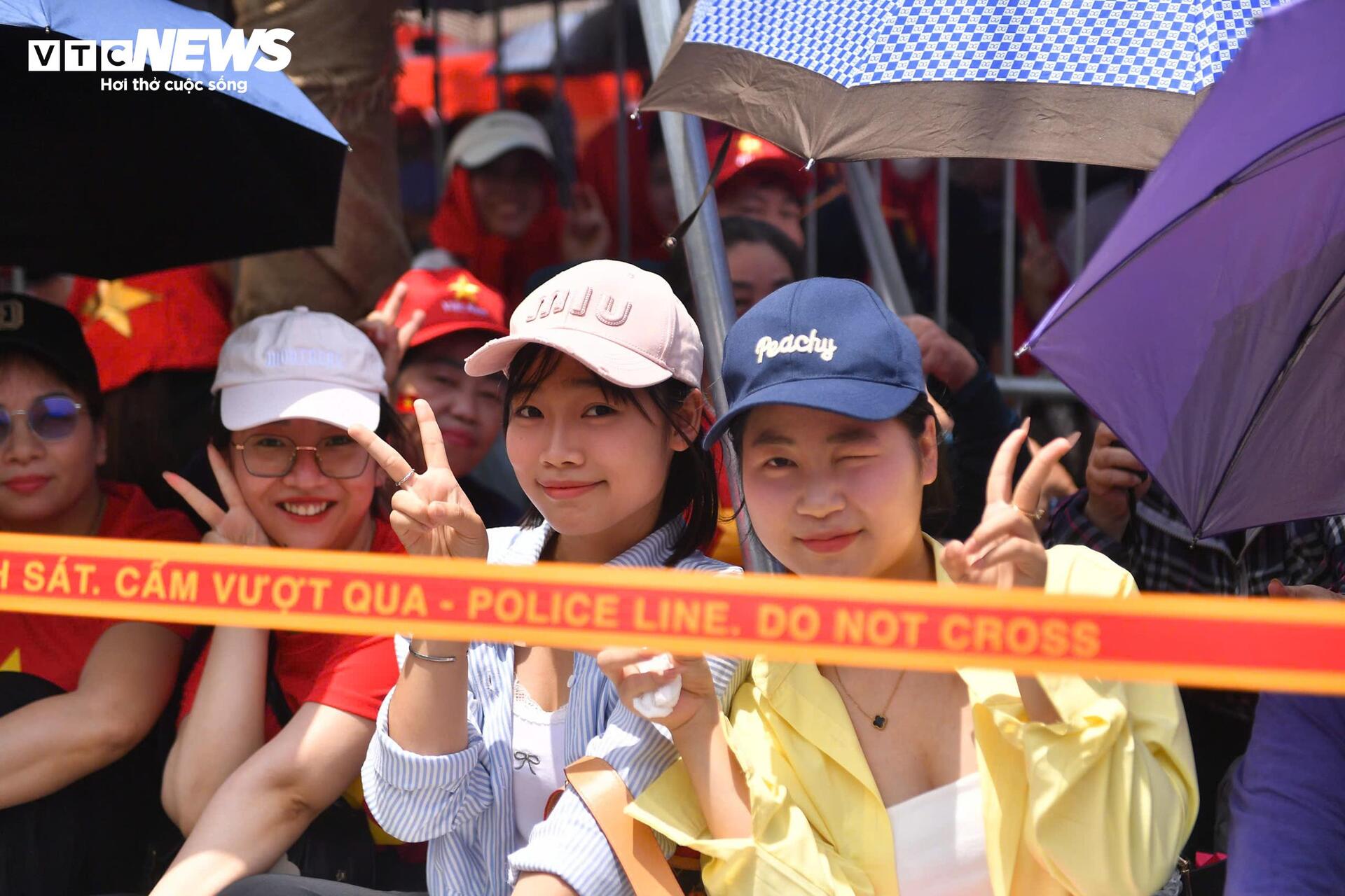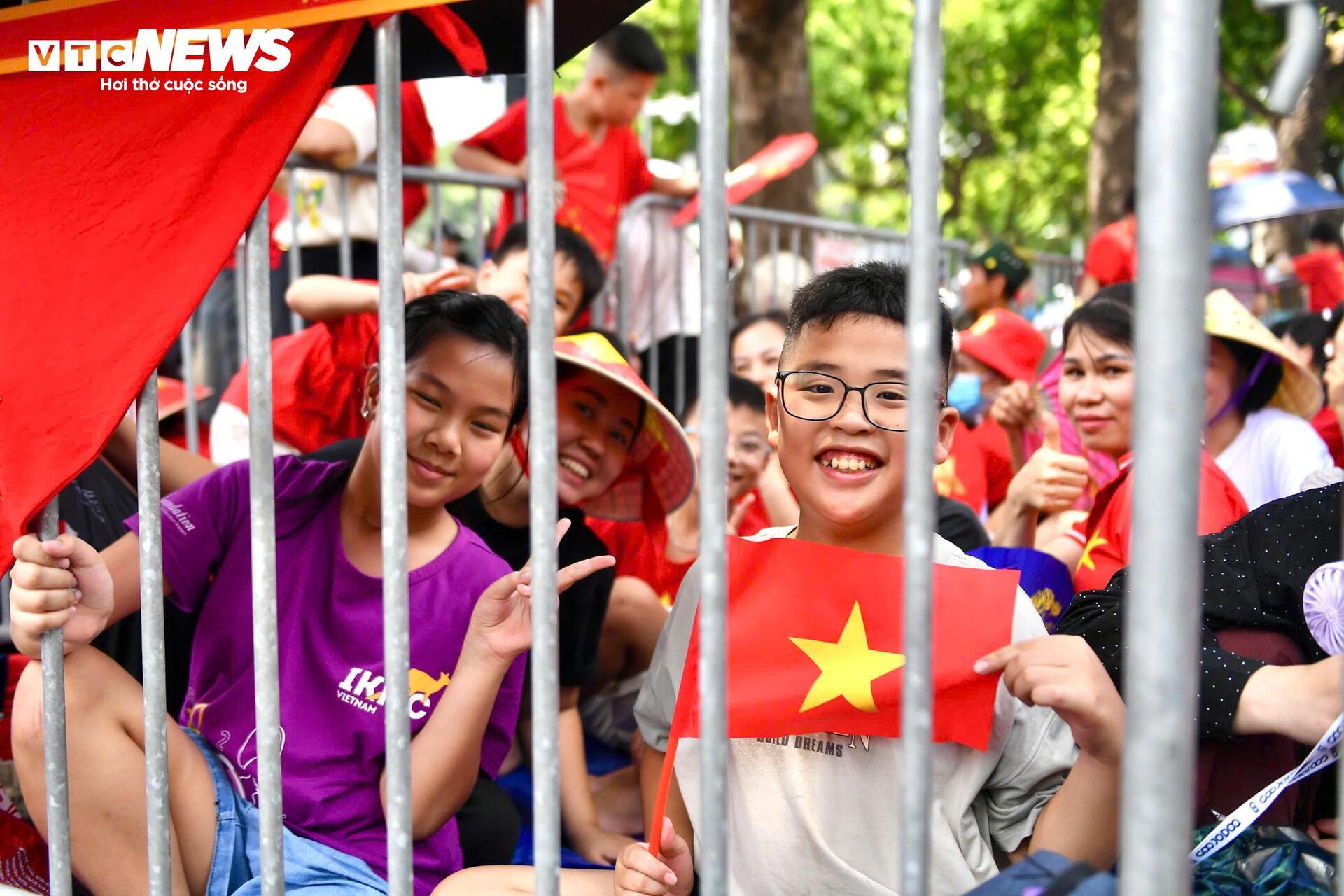 Càng về trưa, biển người vẫn ken kín, bất chấp nắng nóng gay gắt. Nhiều bạn trẻ mặc áo dài, cầm cờ đỏ sao vàng, chụp ảnh lưu lại kỷ niệm.