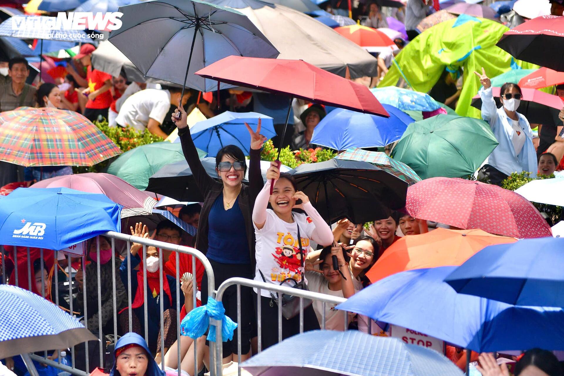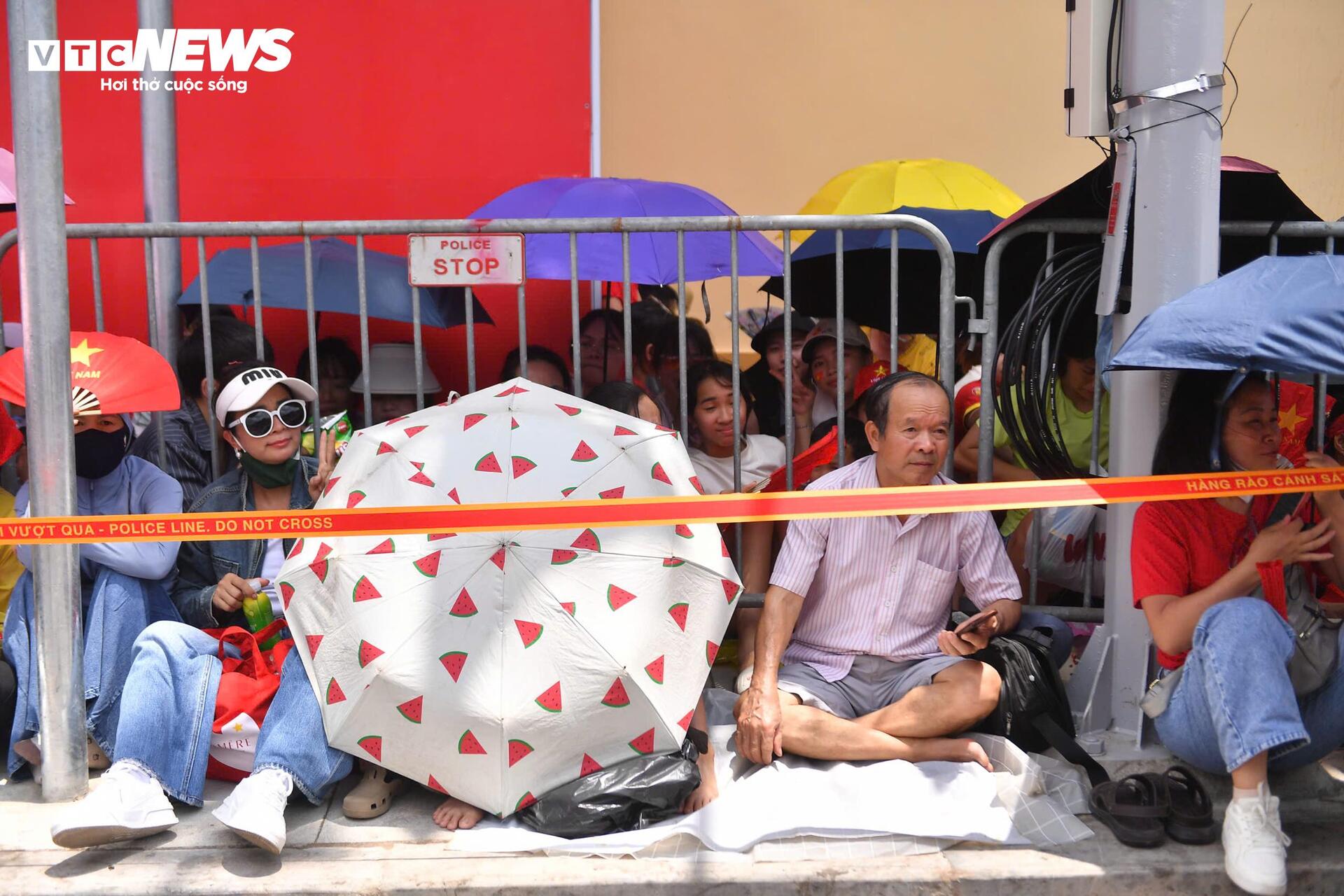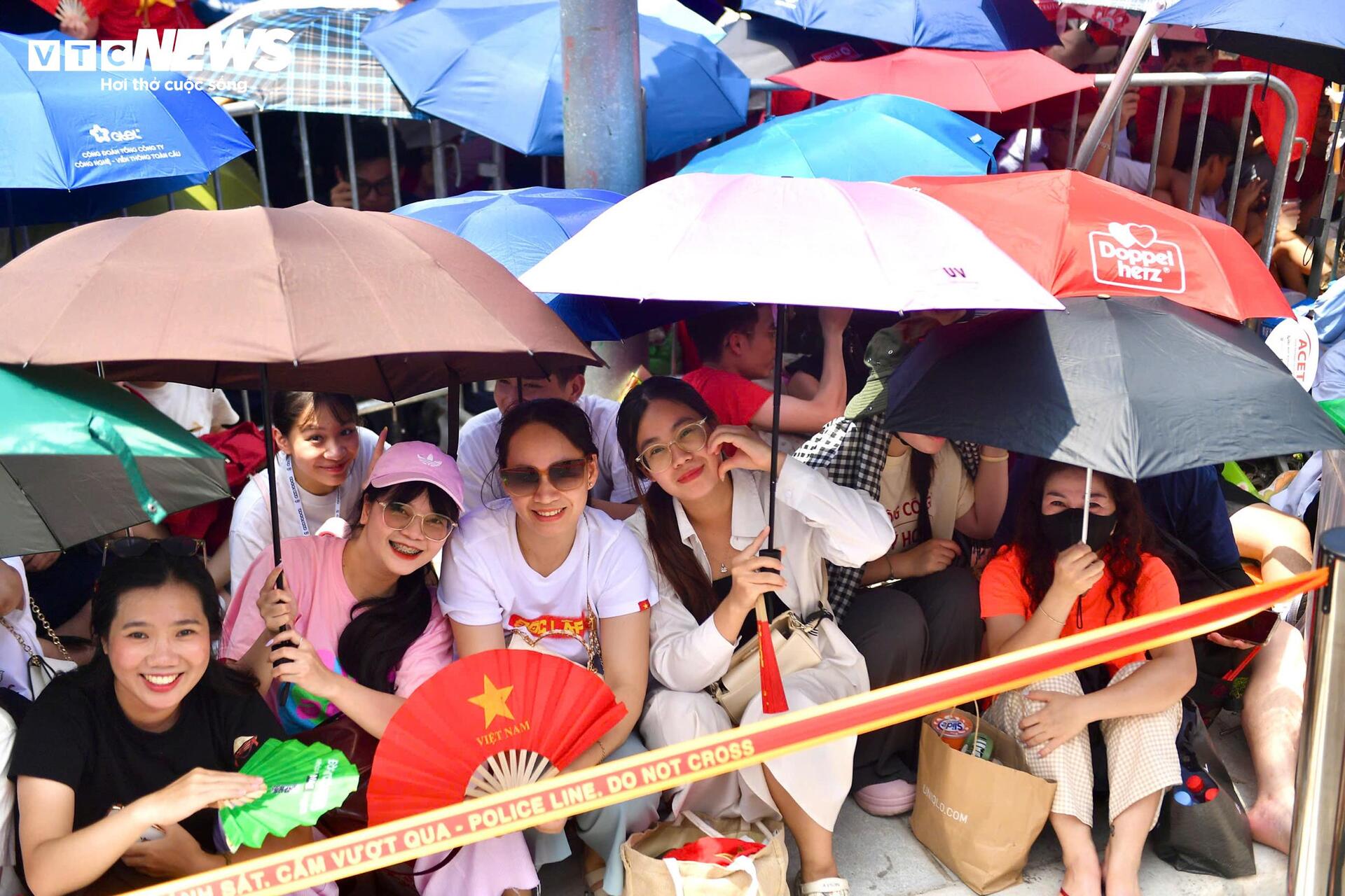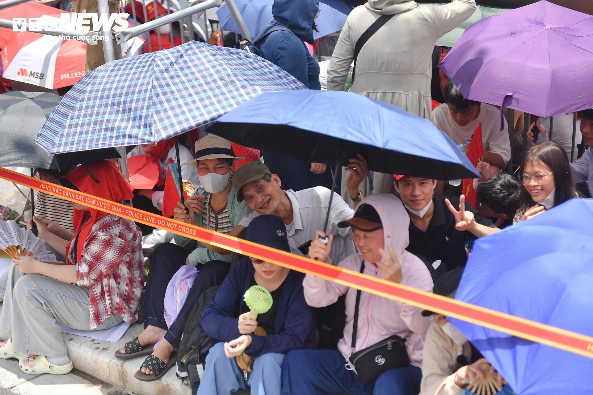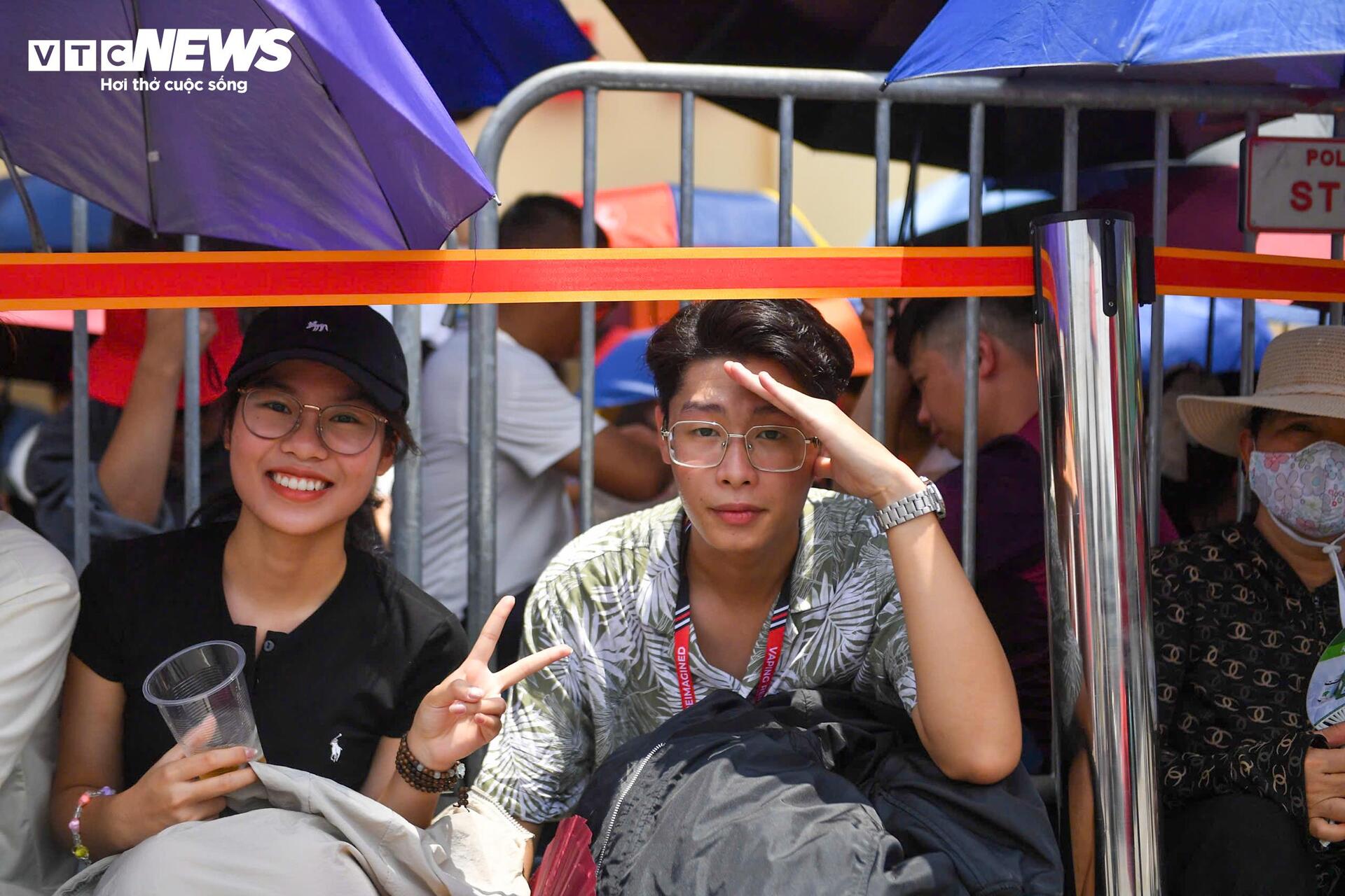 Đến giữa trưa, dòng người càng đông nghịt. Nhiều người chuẩn bị kỹ càng từ đồ ăn, nước uống, đến ô dù, áo mưa để ngồi chờ nhiều giờ đồng hồ.