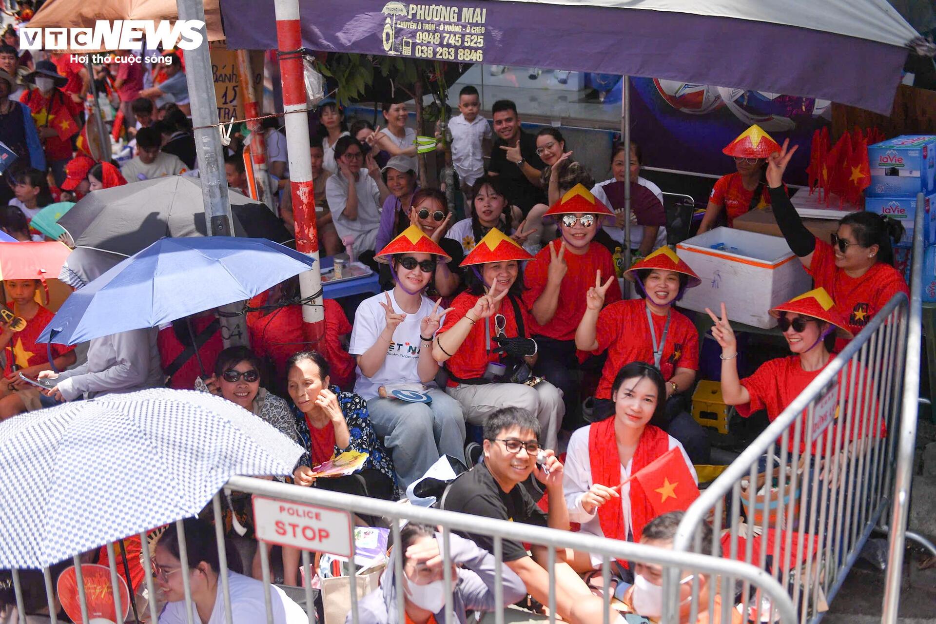 Vỉa hè biến thành những “gian trại nhỏ”, nơi mọi người trò chuyện, ăn uống và háo hức chờ đợi đoàn quân tiến qua.