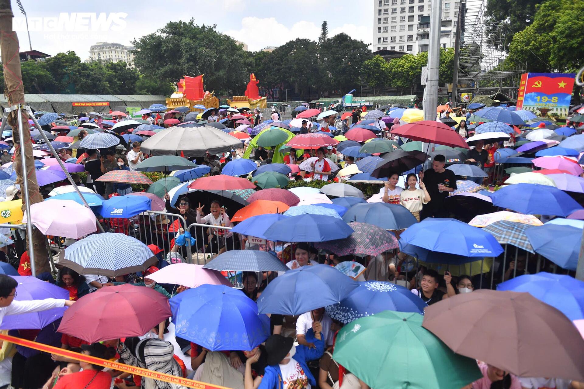 Hàng nghìn người dân từ 4h sáng trải áo mưa, mang theo đồ ăn, nước uống để giữ chỗ xung quanh Quảng trường Ba Đình, chờ xem buổi hợp luyện diễu binh tối 24/8.