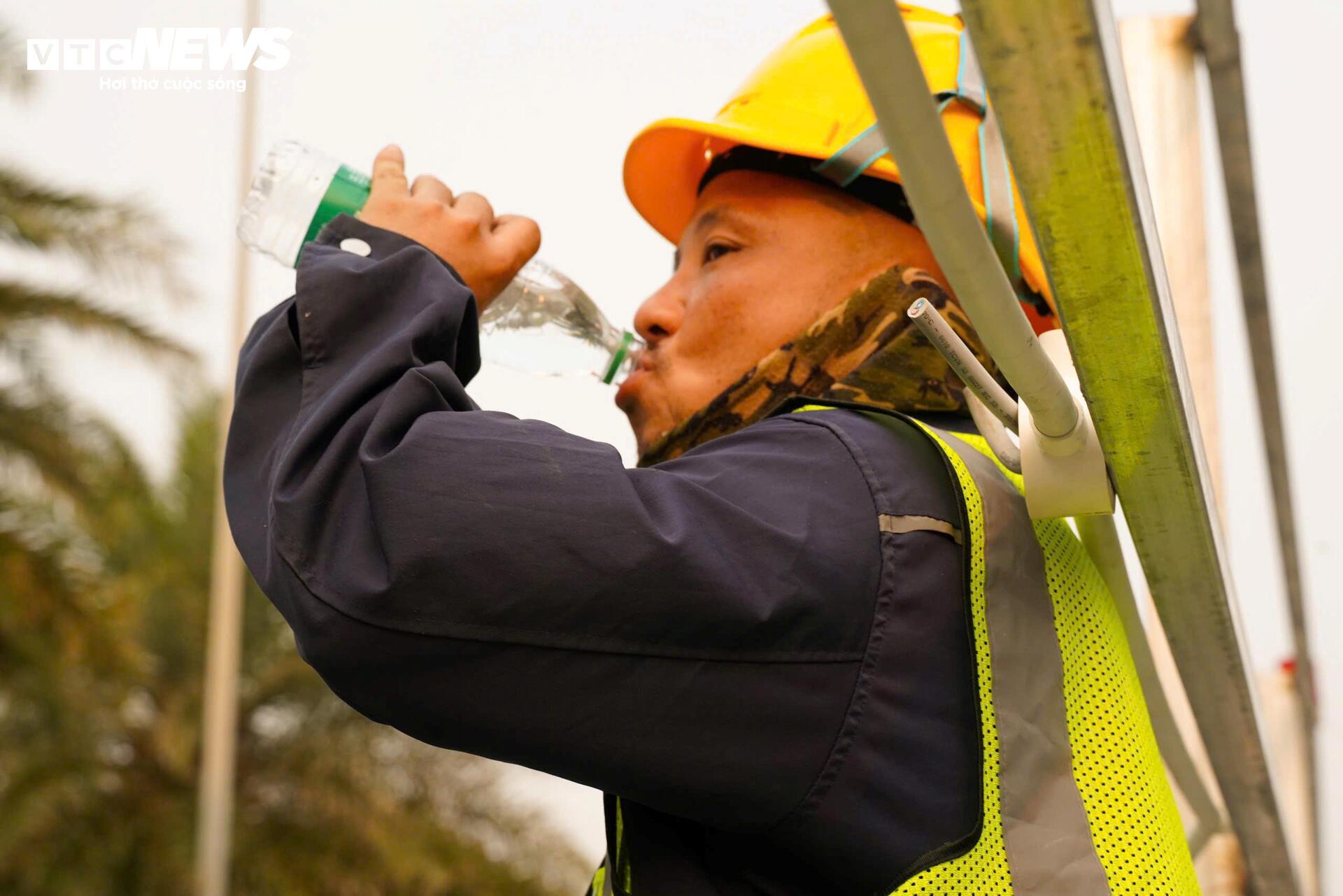 Các công nhân cho biết họ phải chia nhỏ thời gian làm việc, tranh thủ nghỉ ngắn theo từng ca, liên tục bổ sung nước, dùng khăn ướt lau mặt để hạ nhiệt nhằm tránh tình trạng kiệt sức, say nắng.