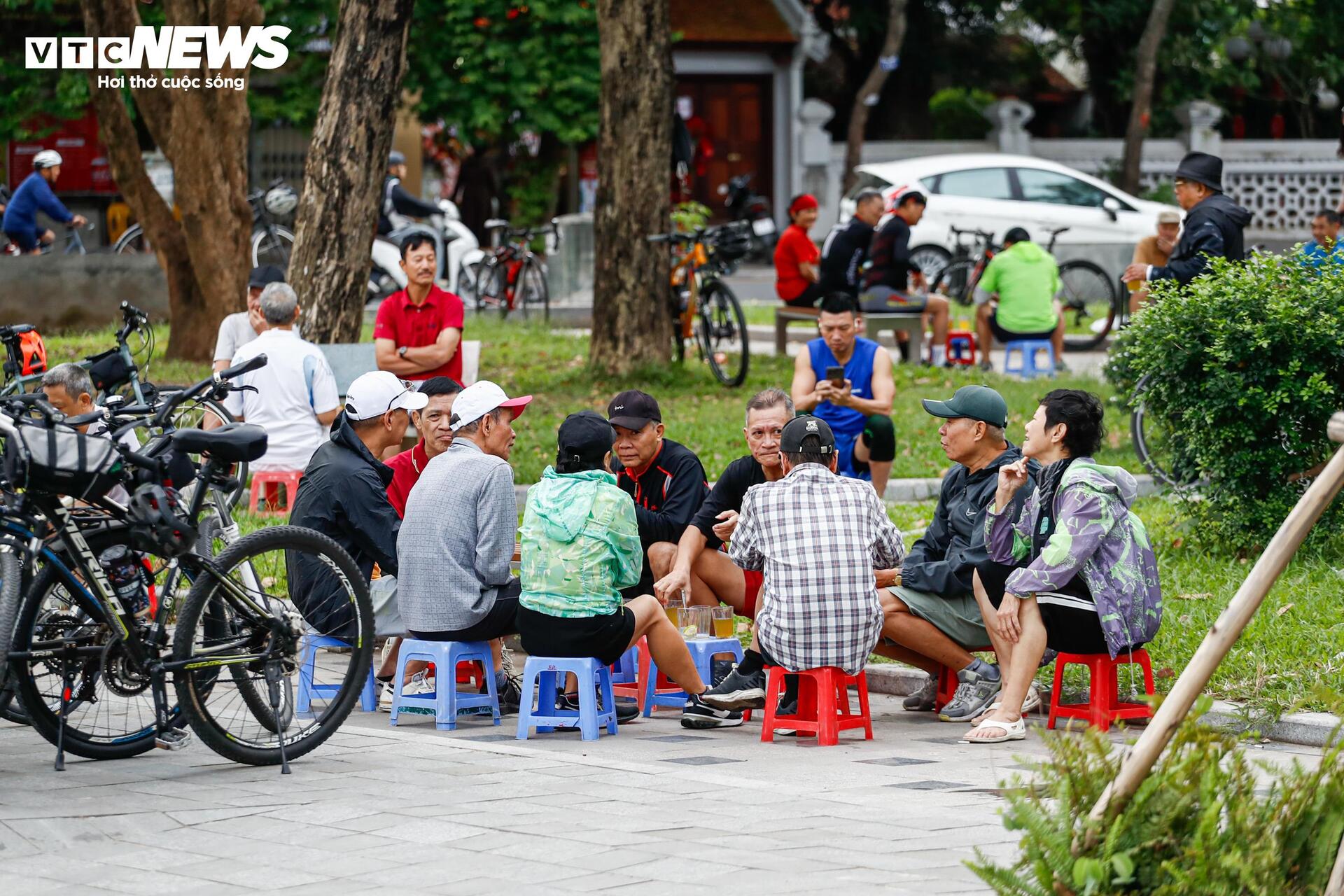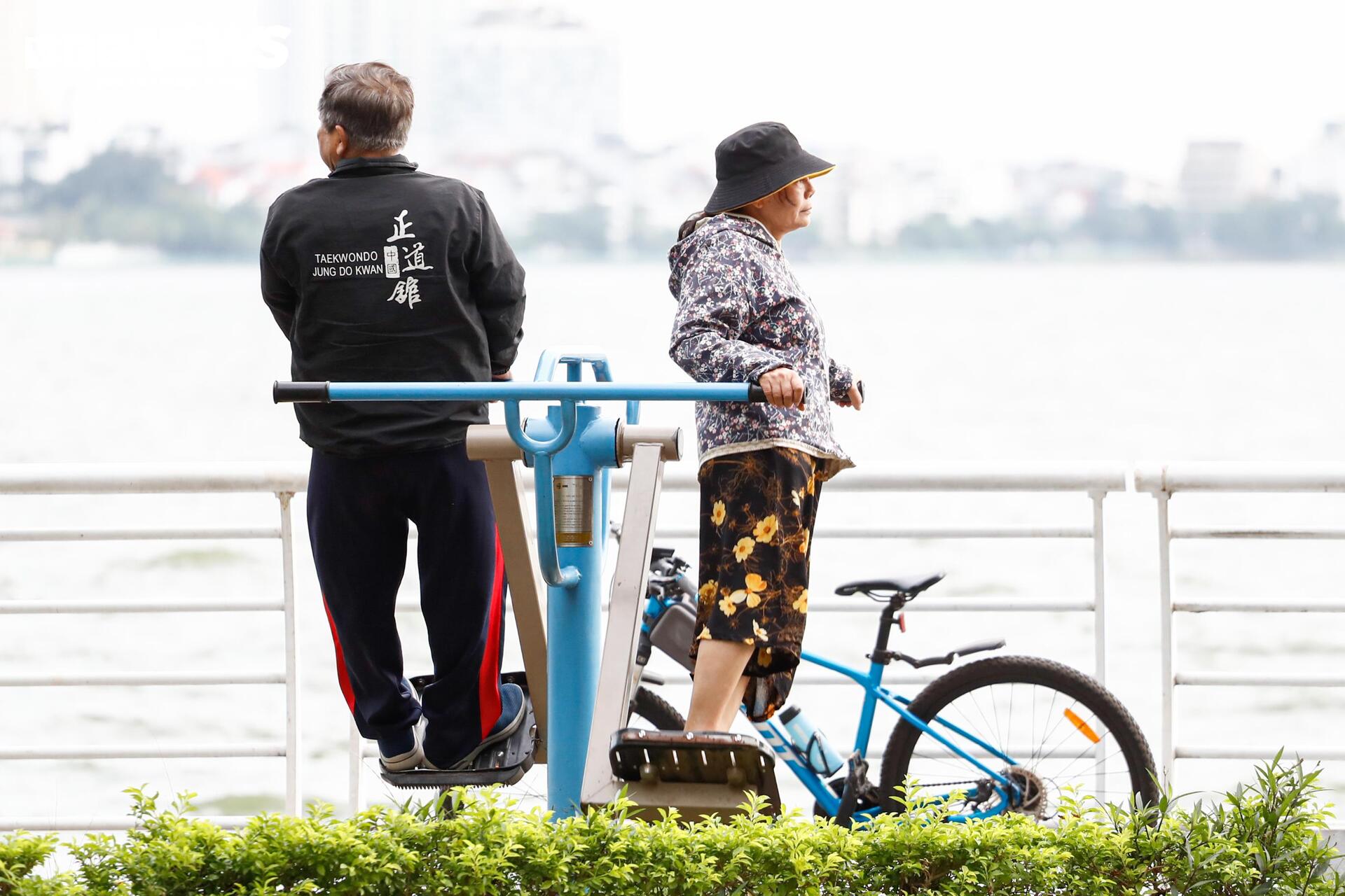 Lúc 5h30, giữa trời hút gió, nhiều người cao tuổi vẫn chăm chỉ vận động, tập thể dục quanh khu vực Hồ Tây.