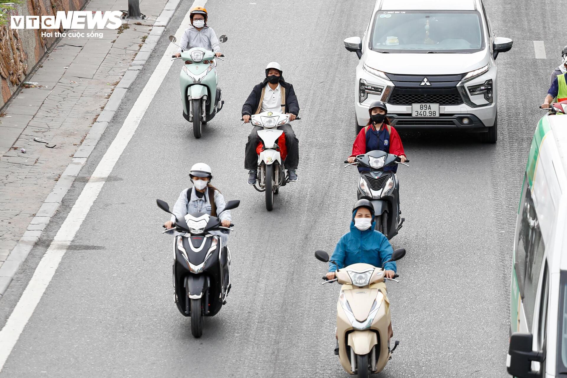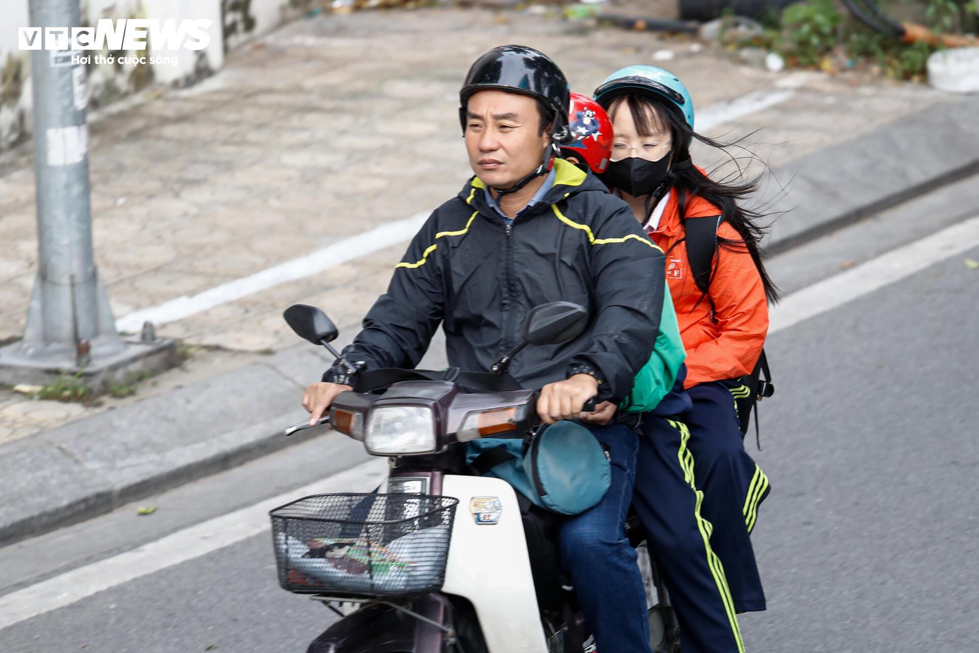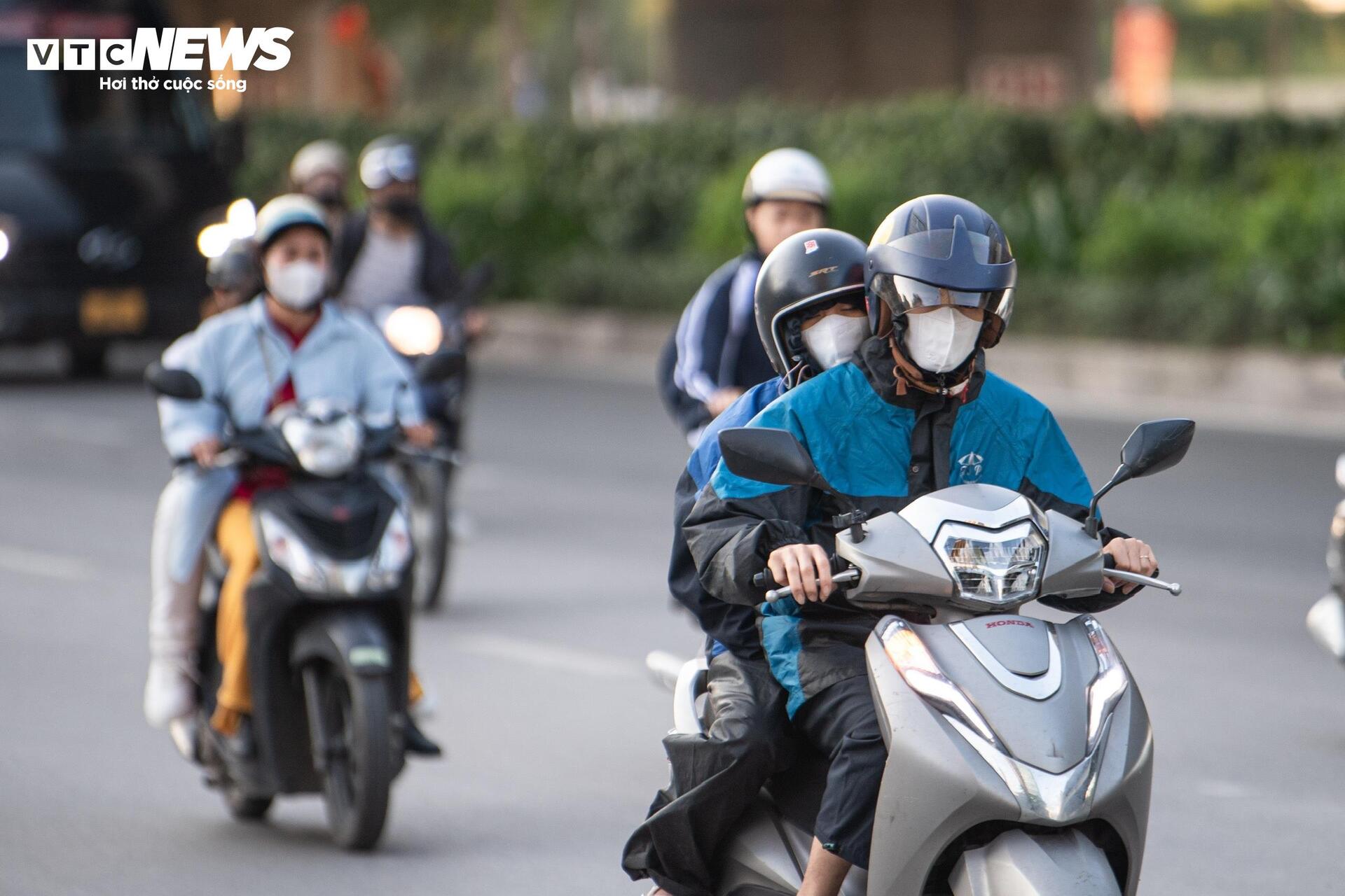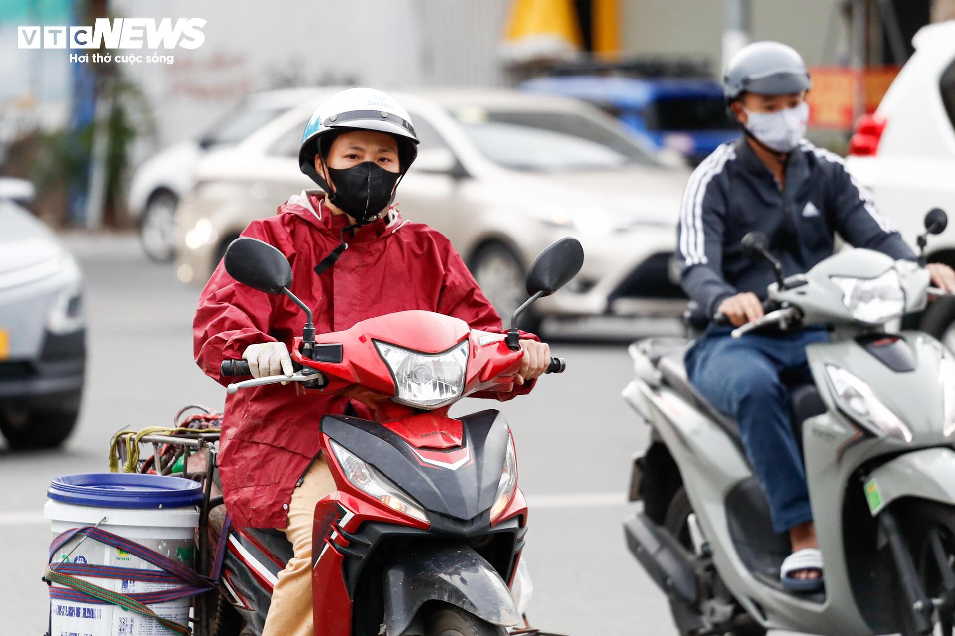 Nhiều người dân không kịp chuẩn bị áo khoác đã linh hoạt chọn giải pháp mặc áo mưa, áo chống nắng để tận dụng khả năng chắn gió khi di chuyển trên đường.