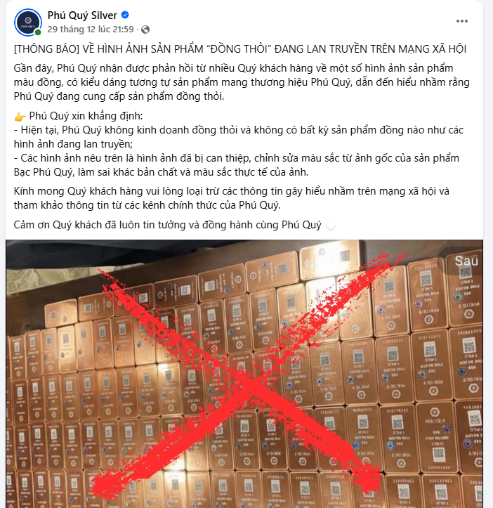 Theo Phú Quý, thời gian gần đây doanh nghiệp nhận được nhiều phản hồi từ khách hàng về các hình ảnh nói trên. Trước thông tin này, Phú Quý khẳng định hiện không kinh doanh đồng thỏi và không cung cấp bất kỳ sản phẩm đồng nào như các hình ảnh đang được chia sẻ.