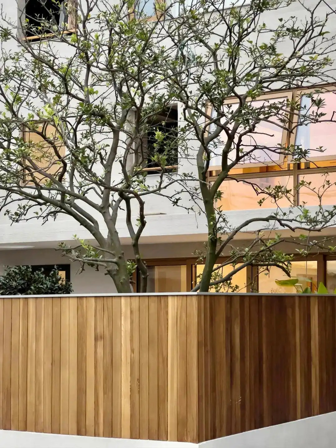 Bà Hứa mời một người bạn làm kiến trúc sư để thiết kế cho không gian sống mơ ước, đề cao tính kết nối giữa các thành viên trong gia đình cũng như kết nối với thiên nhiên. Ngôi nhà có mặt ngoài sơn trắng, các bức tường sân được ốp bằng ván gỗ ghép, tạo nên vẻ ngoài giản dị, gần gũi.