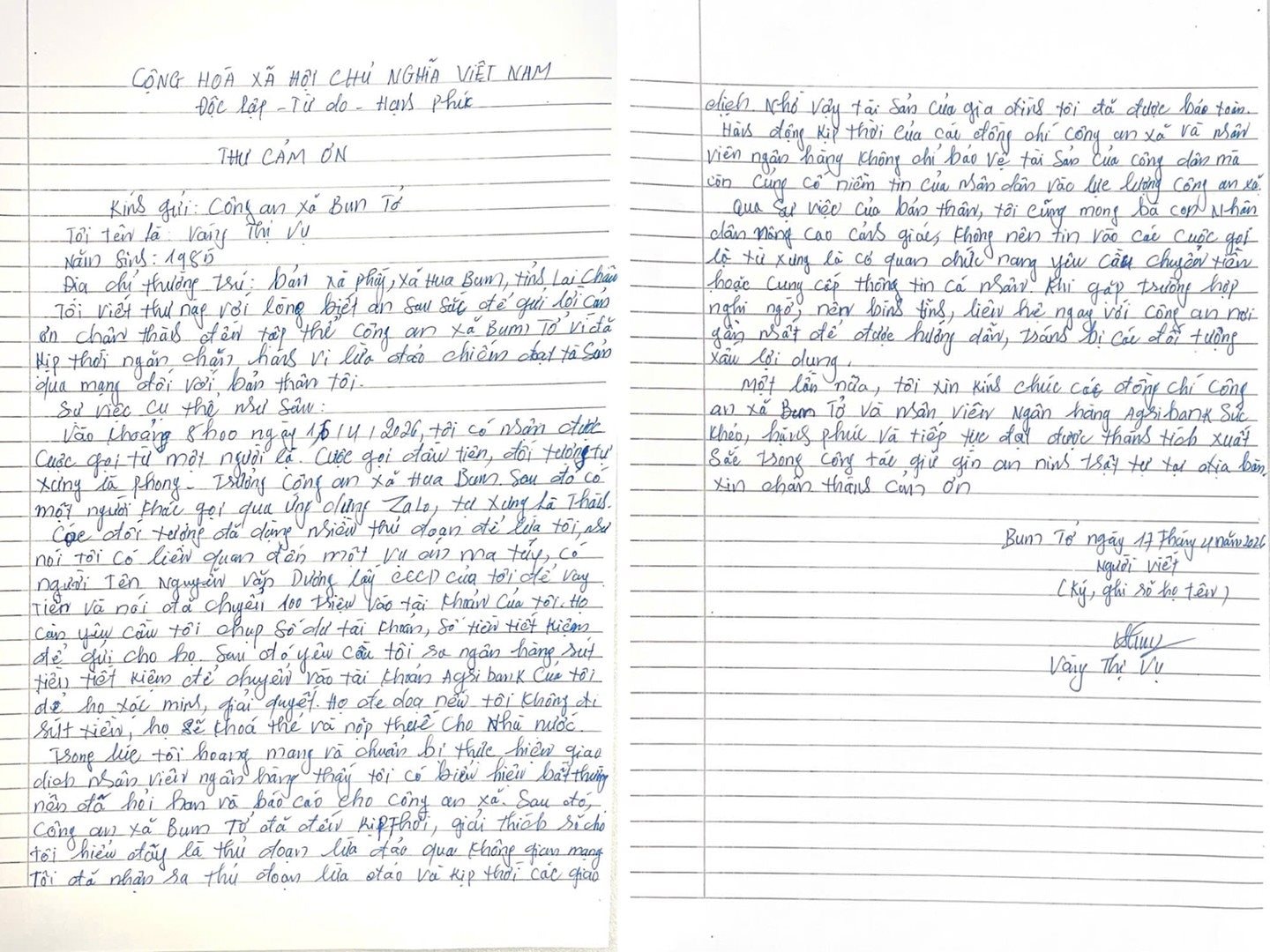 Sau sự việc, chị Vụ đã viết thư bày tỏ sự cảm ơn sâu sắc tới lực lượng Công an xã Bum Tở và cán bộ Ngân hàng Agribank vì đã kịp thời phát hiện, ngăn chặn hành vi lừa đảo, tận tình hỗ trợ, giúp chị tránh được thiệt hại lớn về tài sản. Đây cũng là minh chứng cho tinh thần trách nhiệm, sự phối hợp hiệu quả giữa lực lượng Công an và ngành Ngân hàng trong công tác bảo vệ tài sản, quyền lợi chính đáng của Nhân dân.