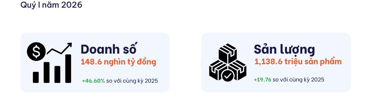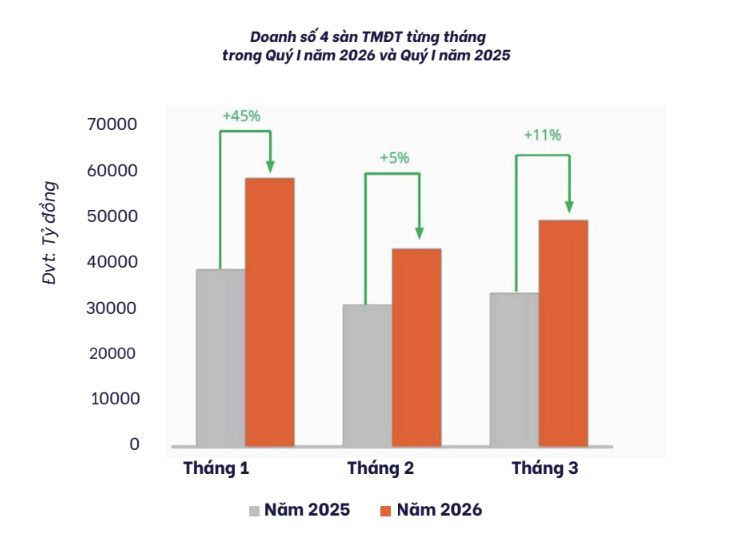 Xét theo diễn biến từng tháng, tháng 1 ghi nhận mức tăng doanh số mạnh nhất, tăng 45% so với cùng kỳ năm 2025. Tháng 2 tăng 5%, trong khi tháng 3 tăng 11%.